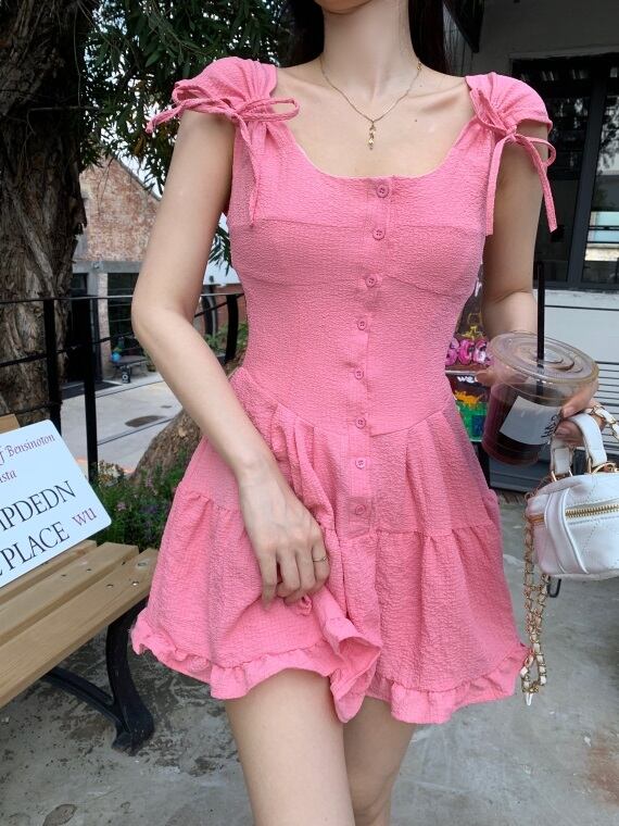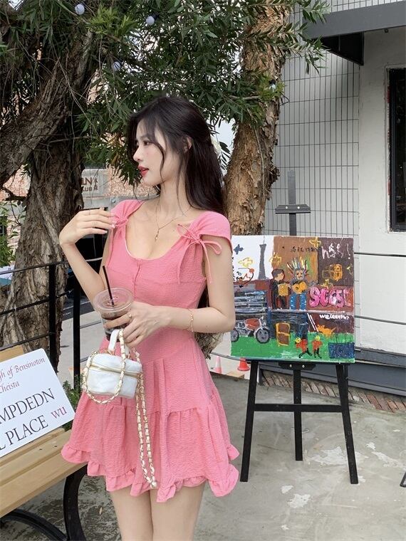 ギャザーウェストドレス サマープリーツスカート ピンク リボン 夏物 Xiaofeijia85596399980