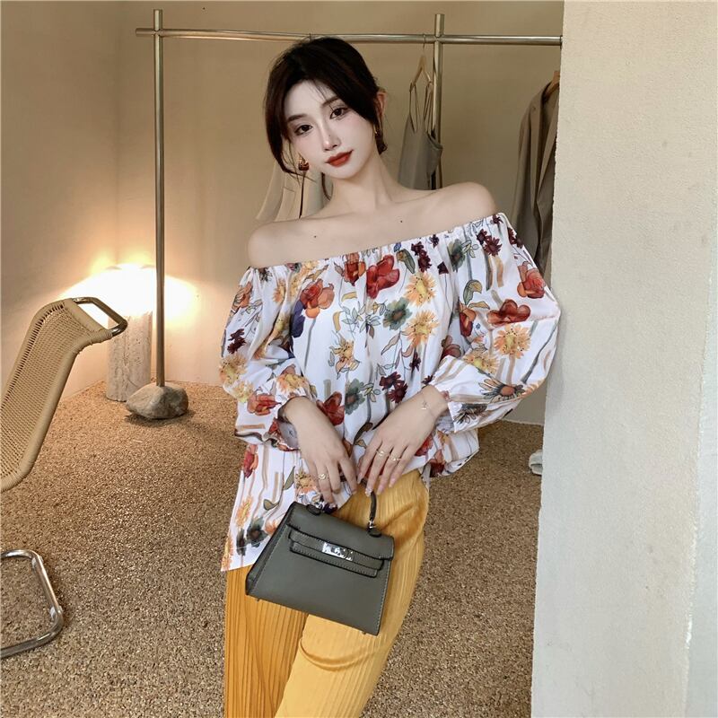 ストラップレスFlowerデザイン シャツ スタイルルーズスリーブトップス オータム ランタンスリーブ 秋物 フラワーデザイン Xiaofeijia49532051686