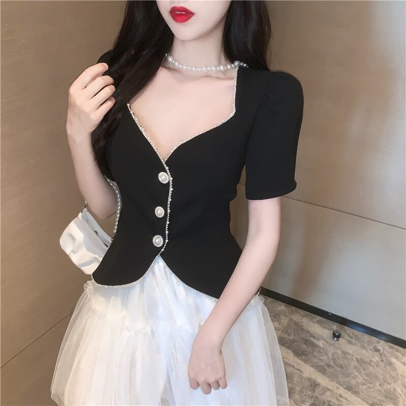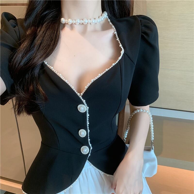 スタイルスリーブパールボタンジャケット レディースストレッチハイウェストウェストメッシュショートスカート サマー エラスティック 伸縮 夏物 真珠 Xiaofeijia19800594236