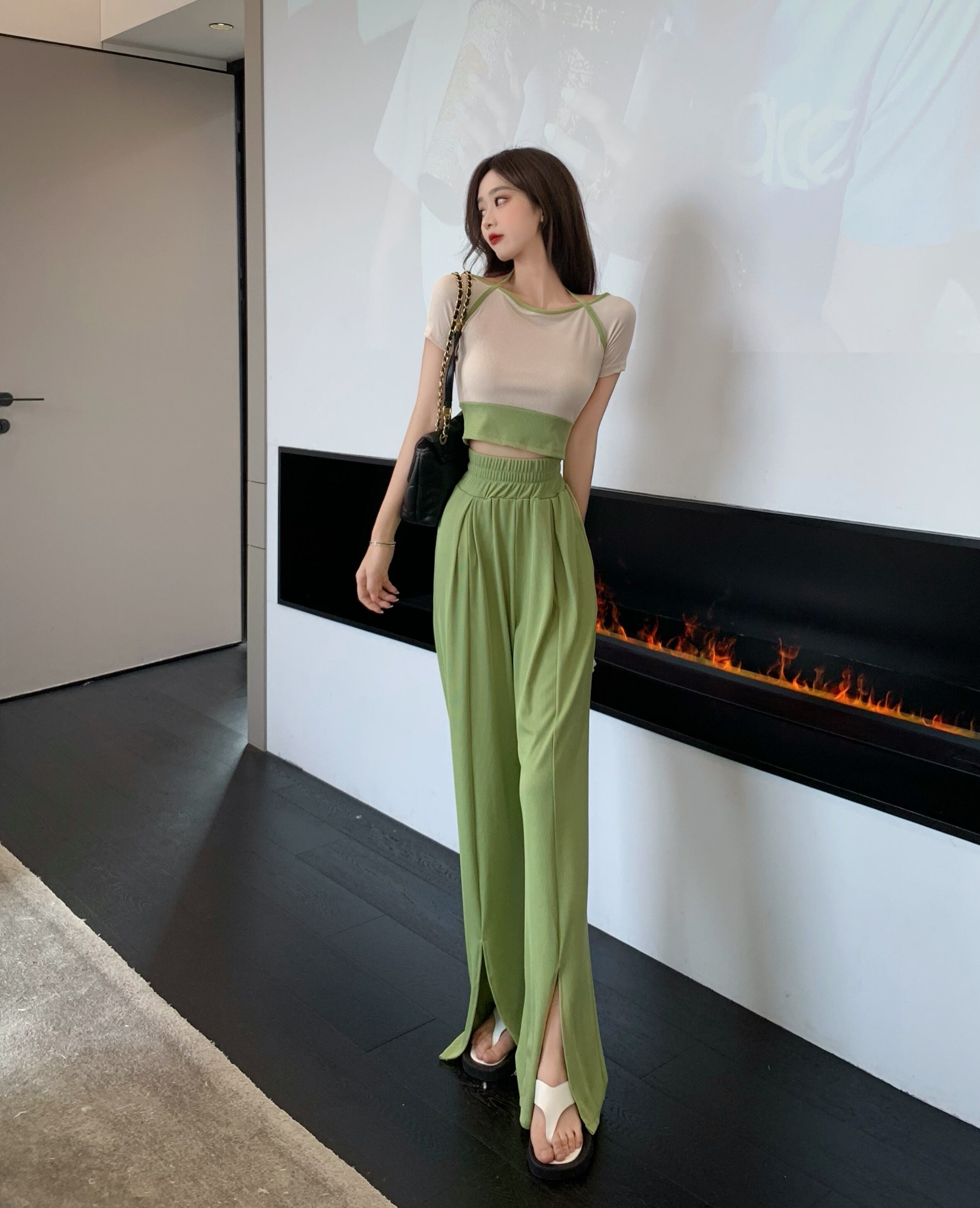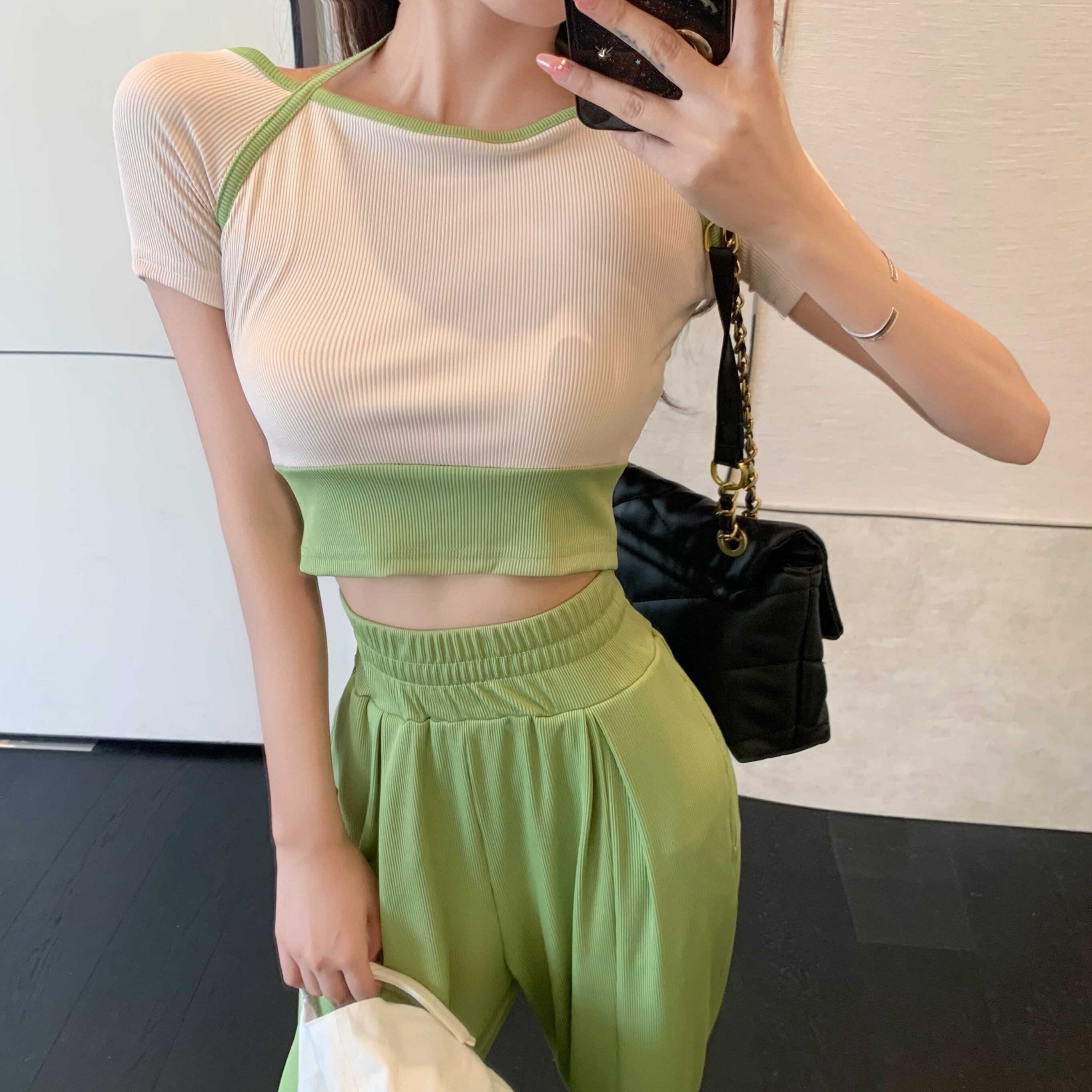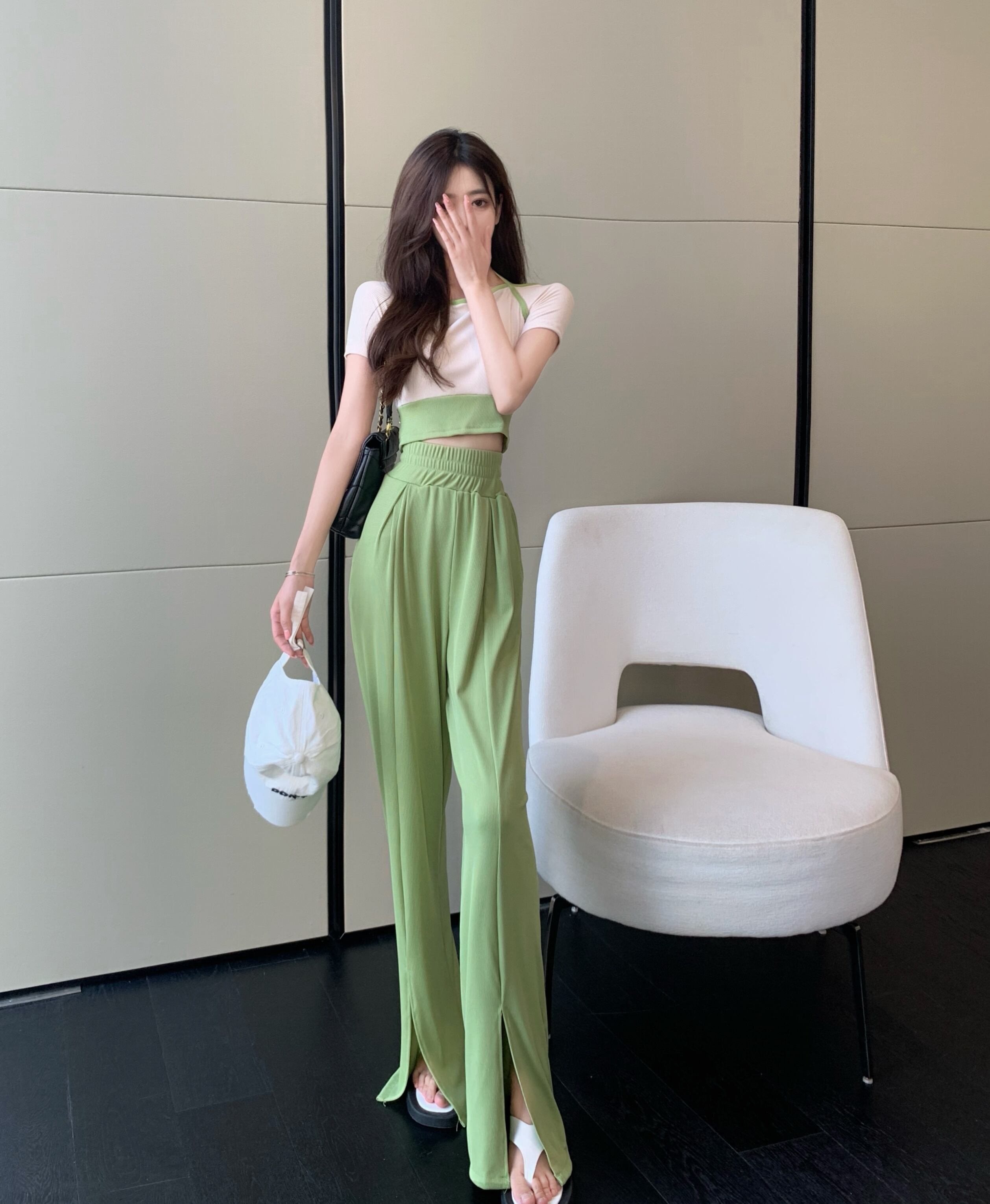 サマーグリーンパンツ ストレッチハイウェストウェストトップス エラスティック 伸縮 夏物 Xiaofeijia30623566859