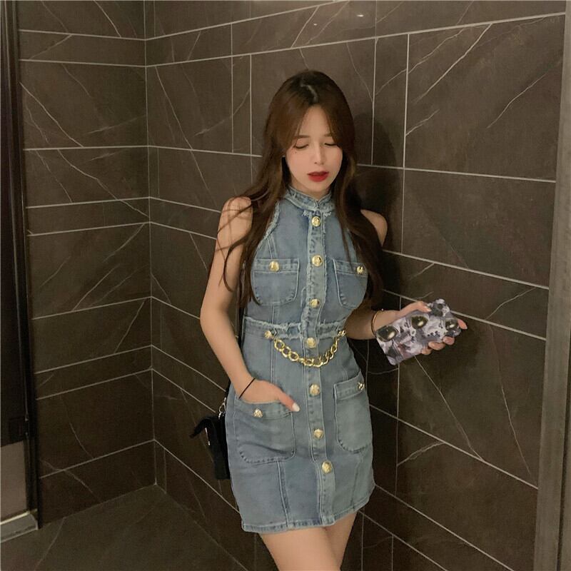 チェーン ノースリーブスカート サマーメタルバックルドレス 夏物 オフショルダー Xiaofeijia42154666795