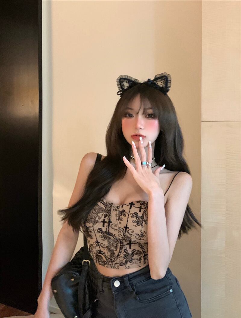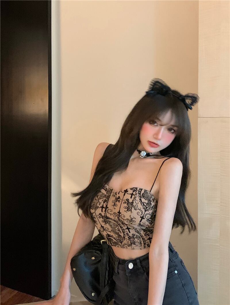 スタンダードプリント柄サマーショートバックトップス レトロ 夏物 Xiaofeijia26809062456