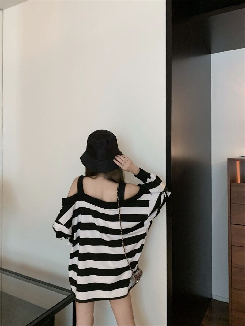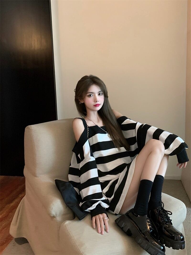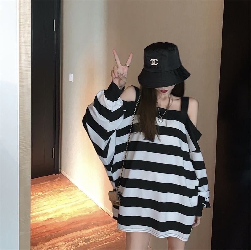 オータムルーズロングストラップレスストライプセーター スタイルシャツ ランタンスリーブ 秋物 Xiaofeijia42648754260