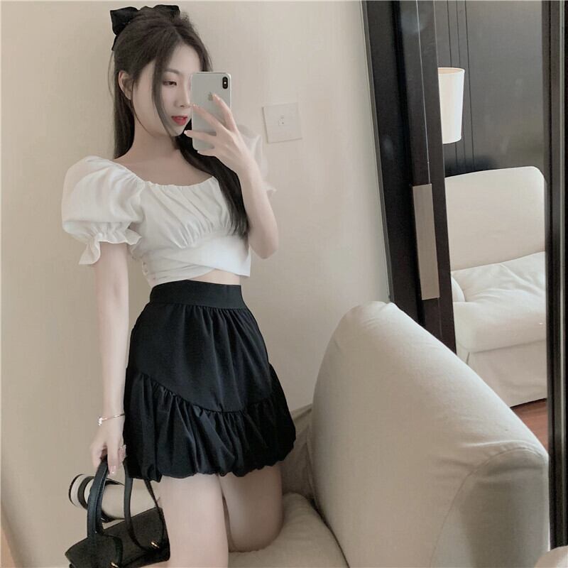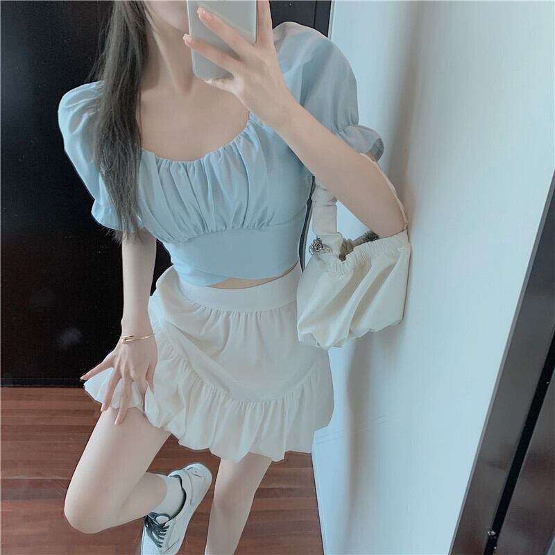 スリーブブラウス レディースサマーショートシャツ プリーツホルター レース 大人ガーリー スウィート キュート カジュアル 夏物 レースアップ Xiaofeijia31872747158
