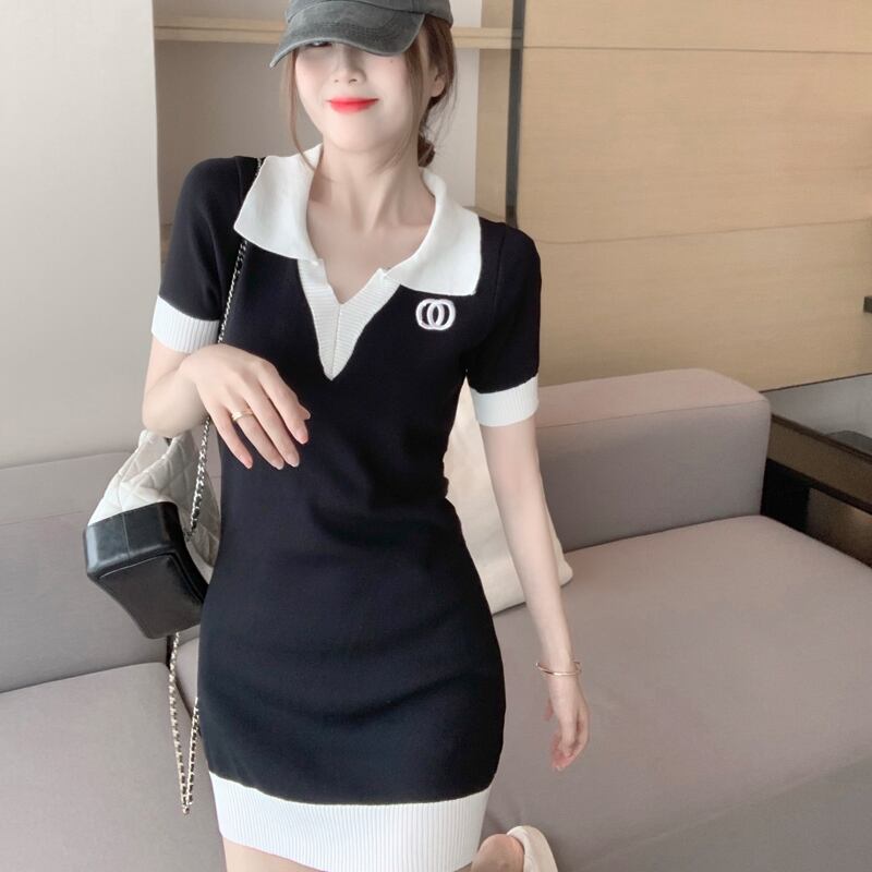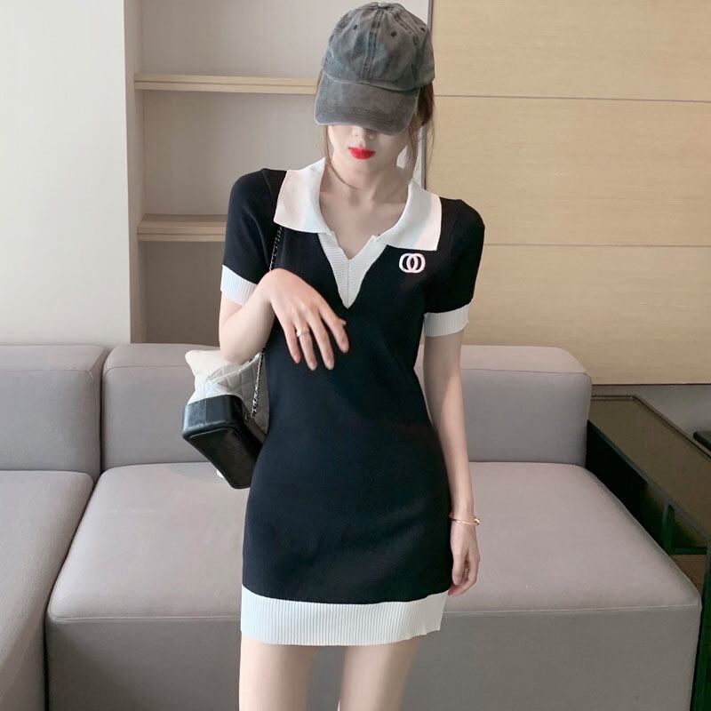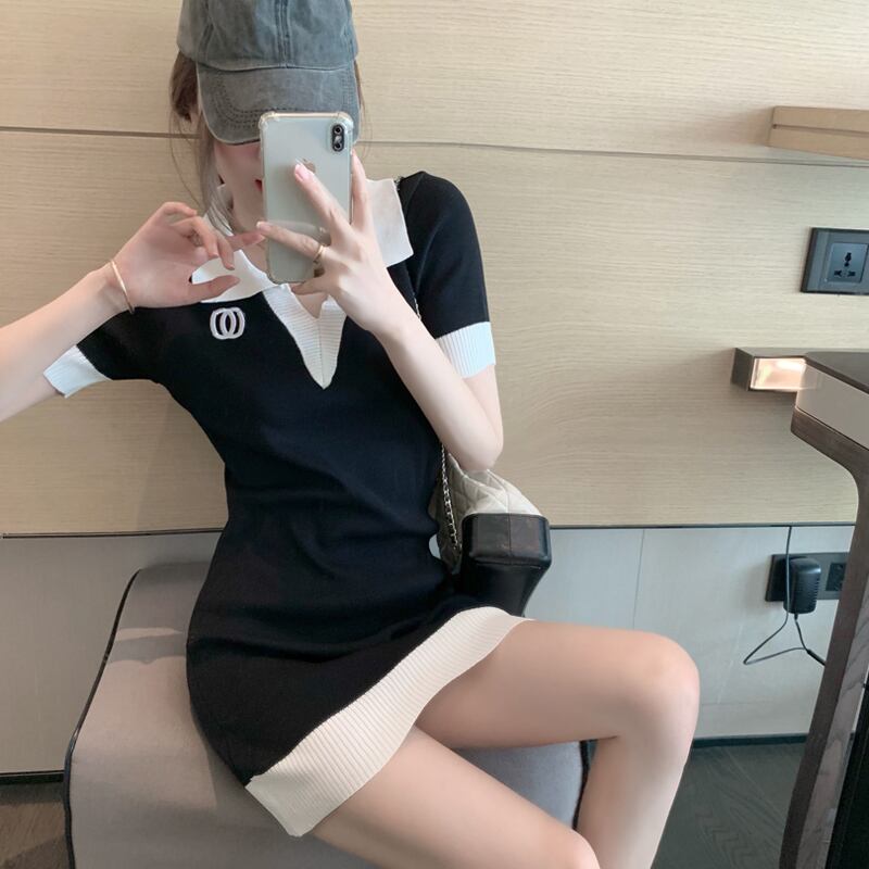 ブラックホワイトカラーニットドレス スカート サマースリムショート 夏物 Xiaofeijia94995373712