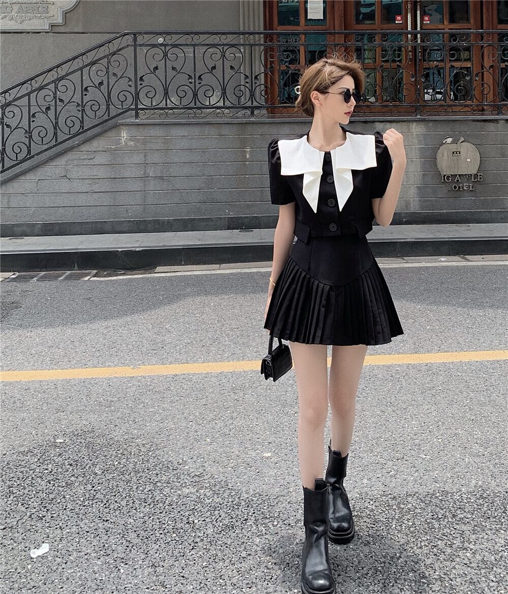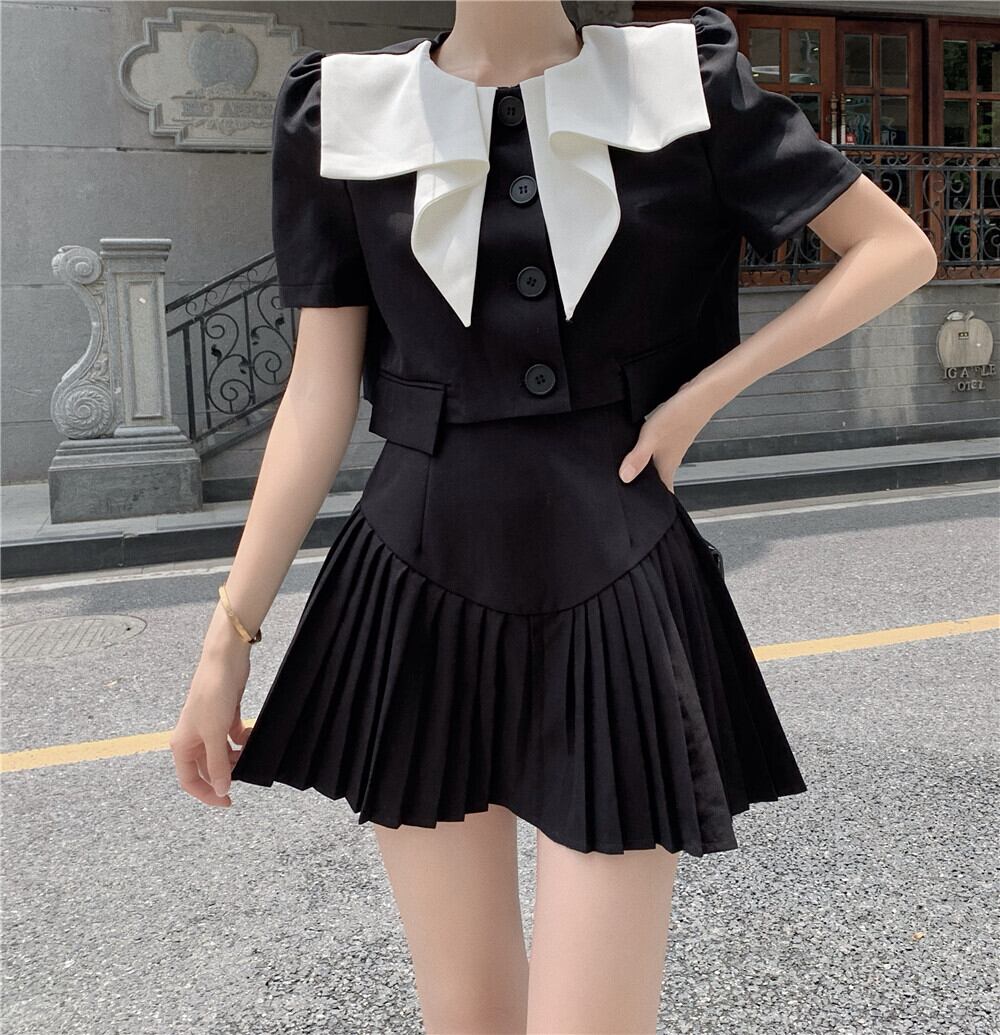 ドレス カラースリーブショートハイウェストウェストプリーツスカート スタイルサマー 夏物 Xiaofeijia96991623063