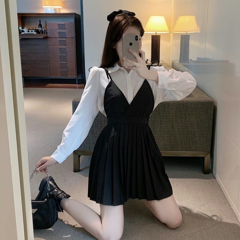 オータムスカート カラーホワイトシャツ リボンプリーツショート ロング 秋物 Xiaofeijia70873036188