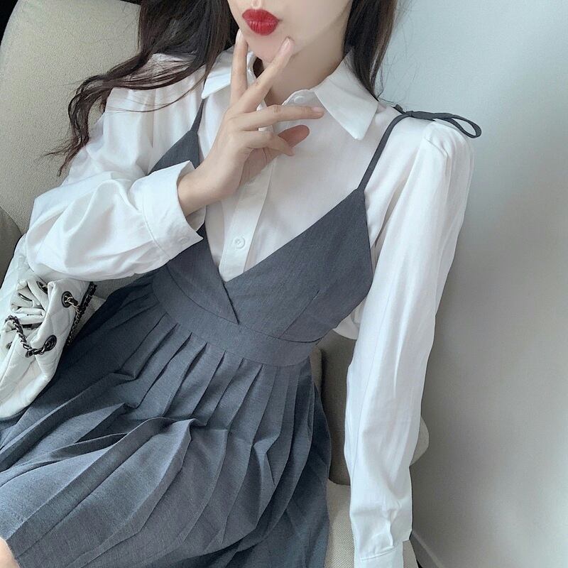 色:白のシャツ,グレーのドレス,ブラックサスペンダースカート