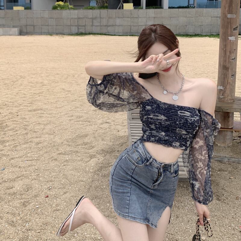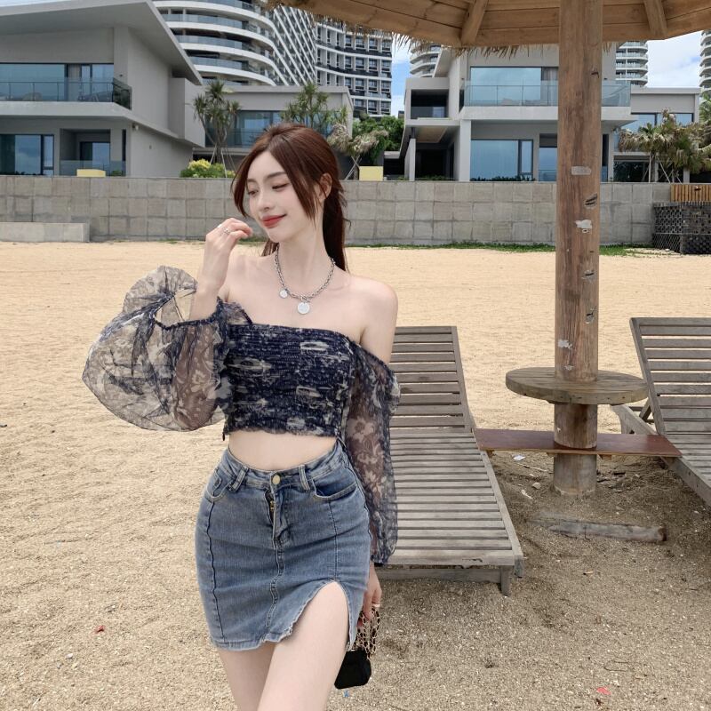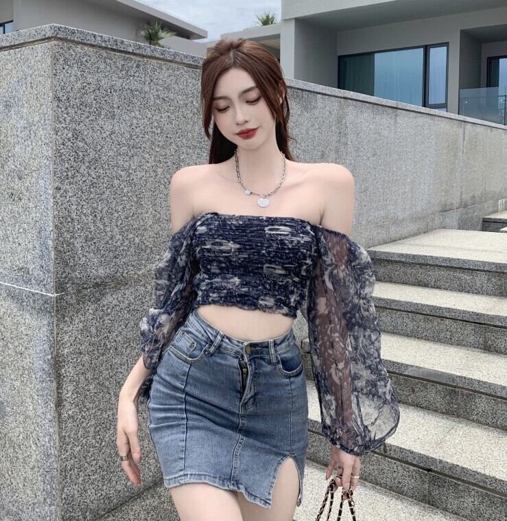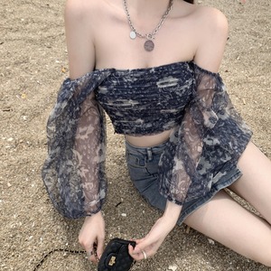 フローラルブラウス サマースタイルスリーブショートトップス オフショルダーシフォン ランタンスリーブ 夏物 花柄 Xiaofeijia55918199191