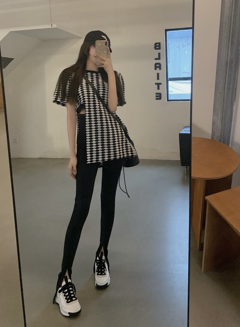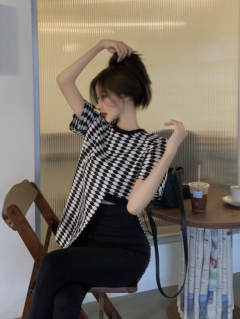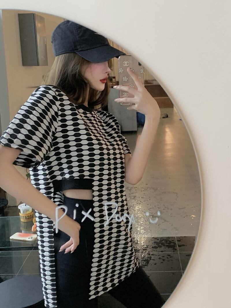 ブラックホワイト格子柄Tシャツ サマールーズスタイルロングトップス 夏物 Xiaofeijia85822837789