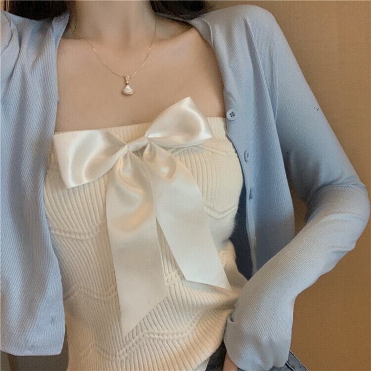 サマーバックニットスリムショートシャツ リボントップス 夏物 Xiaofeijia43564857357