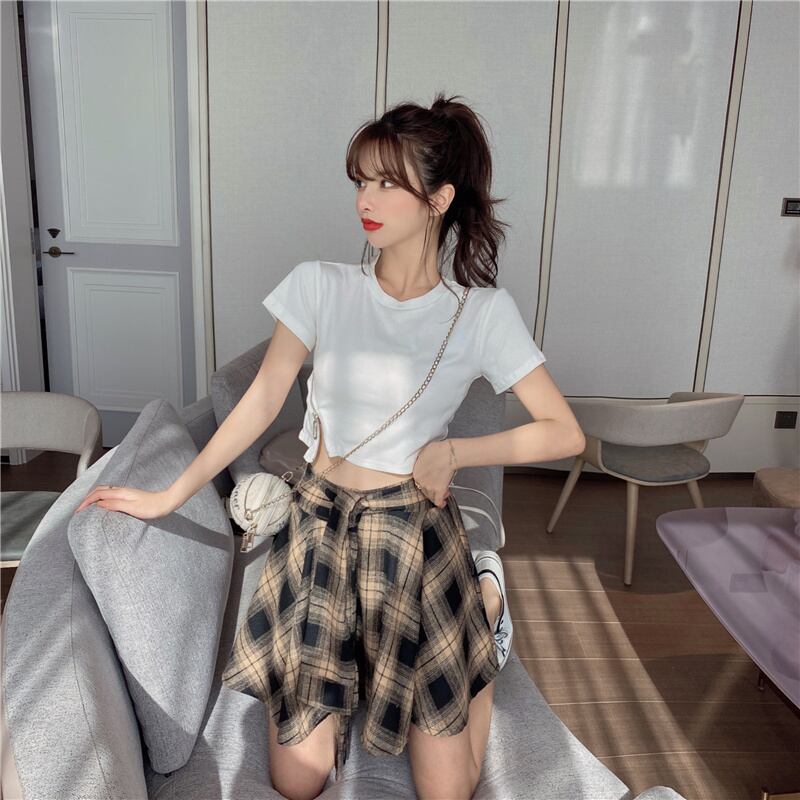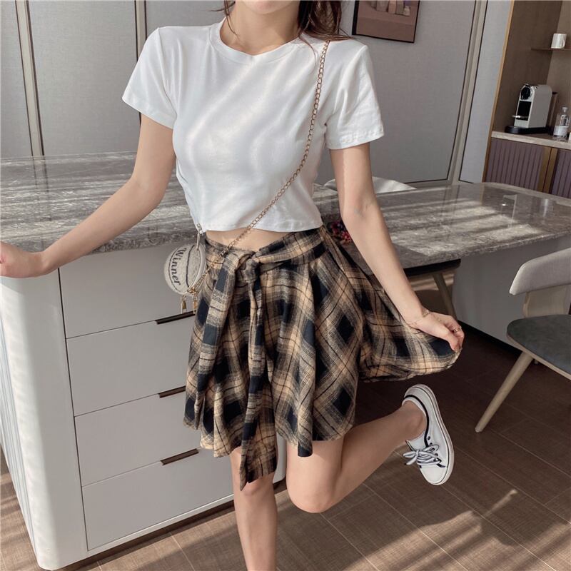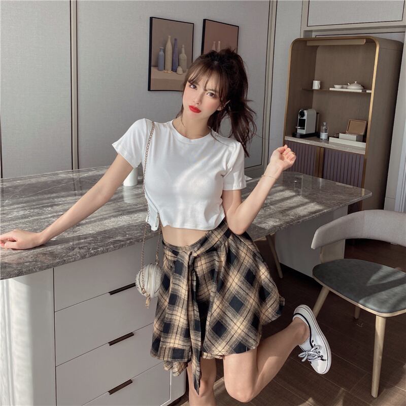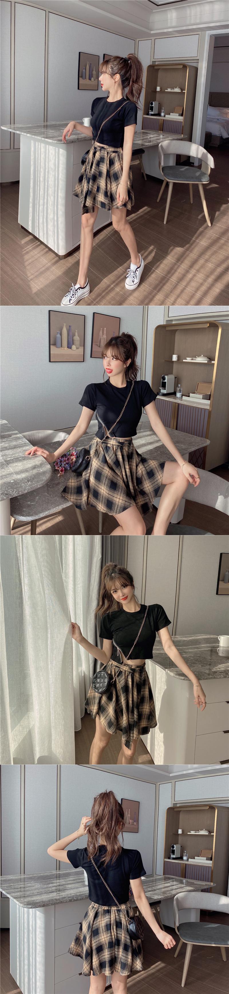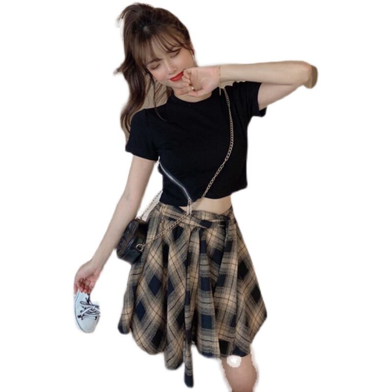 サマーレッドウェスト格子柄スカート セット スリムTシャツ ストリート 夏物 Xiaofeijia80440430367