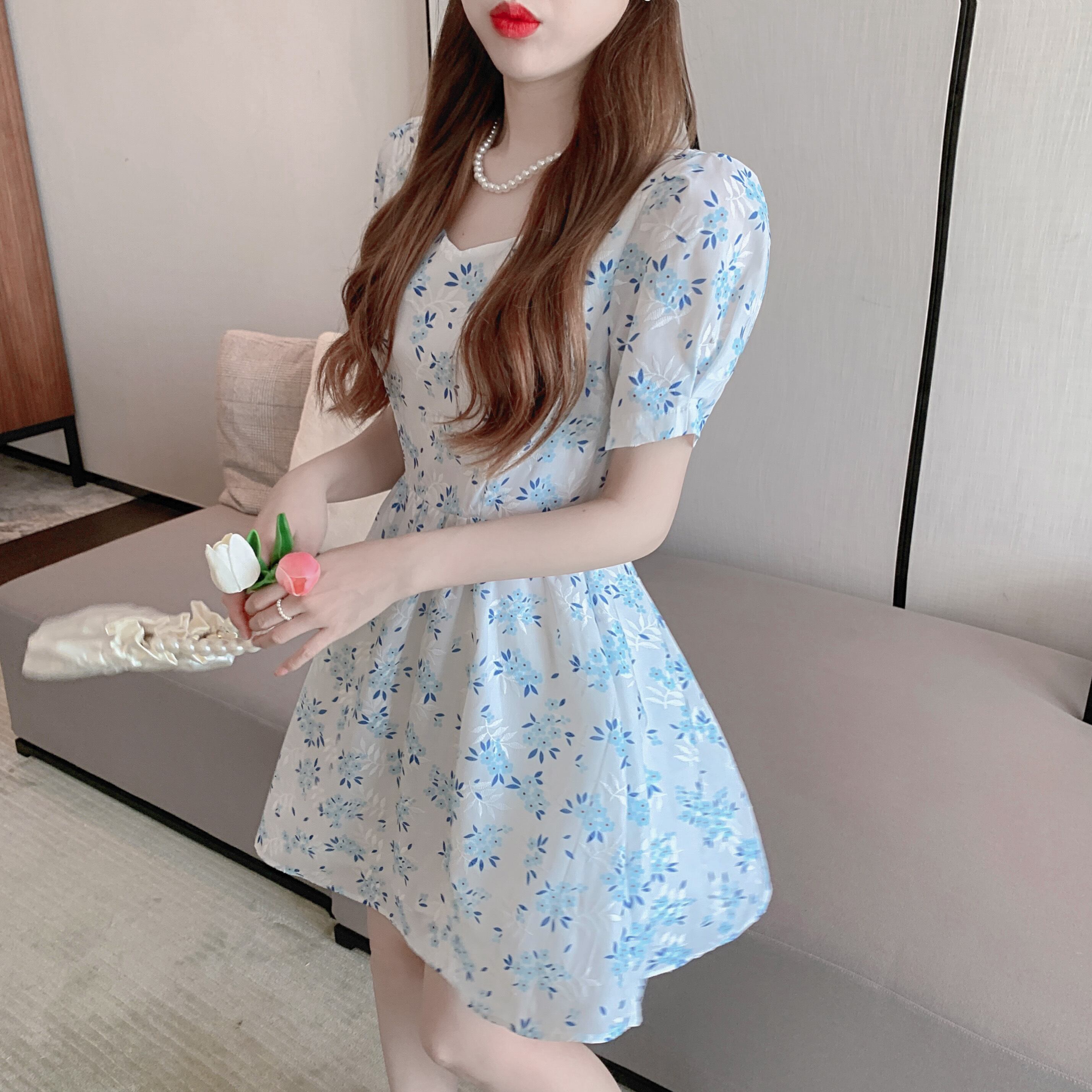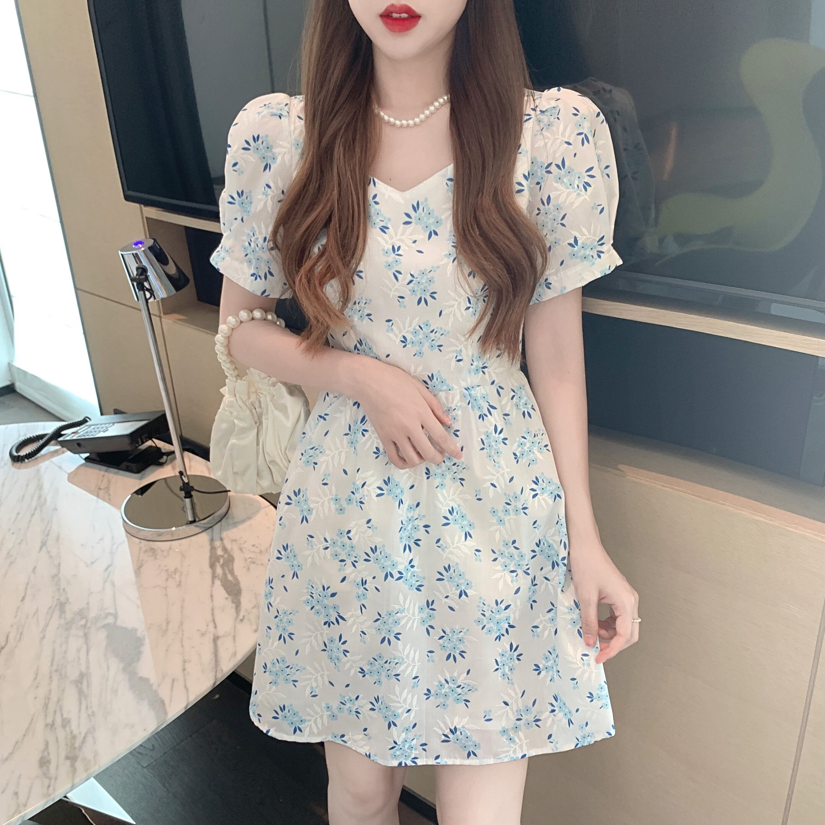 ブルーフローラルドレス サマーバックスリーブスカート レディース リボン 夏物 花柄 Xiaofeijia94546072878