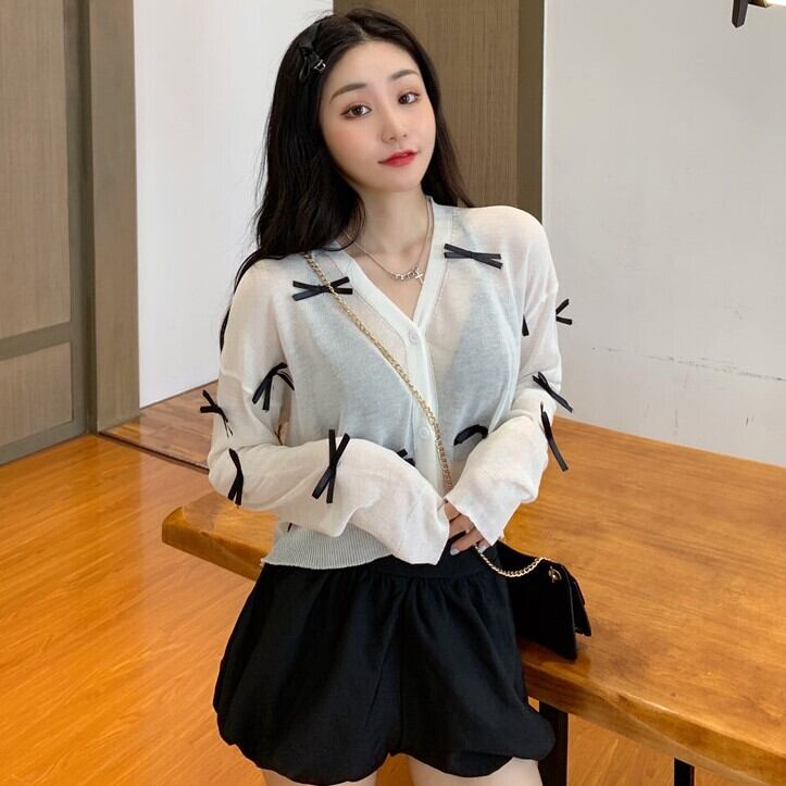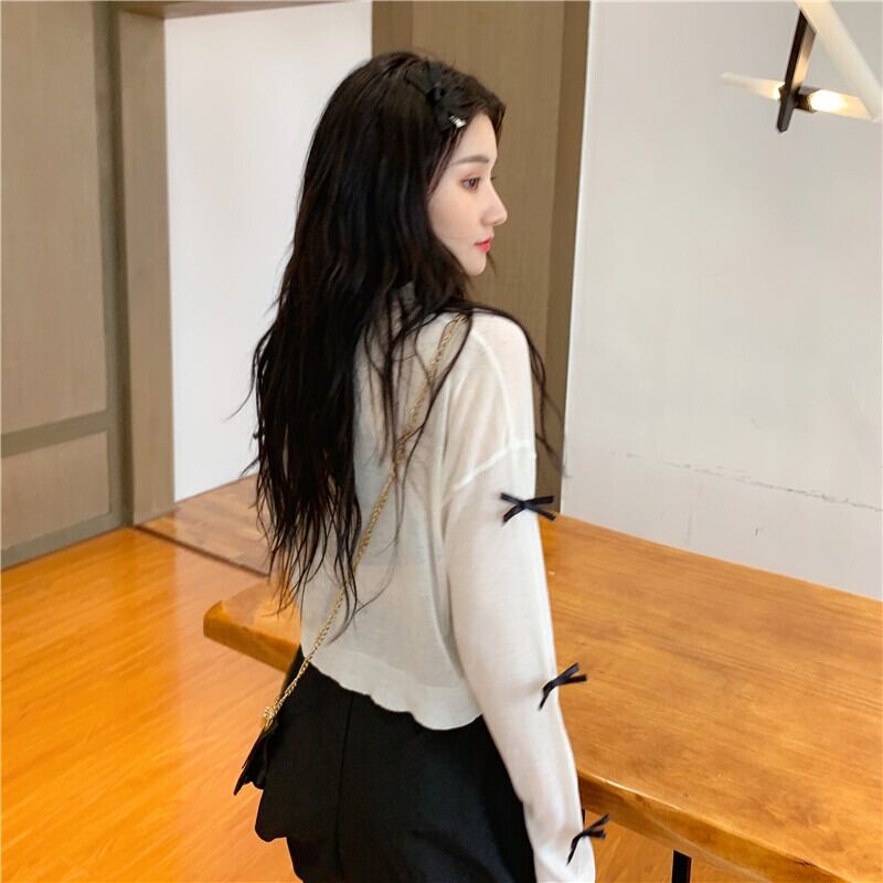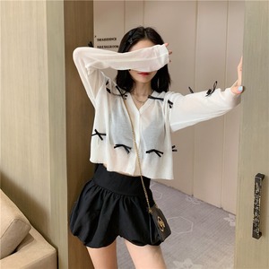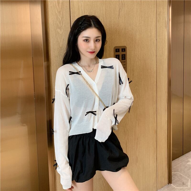 スプリングサマー薄手カーディガンジャケット ルーズリボンショートニットセーター トップス レディース ロング 春物 夏物 Xiaofeijia82206727824