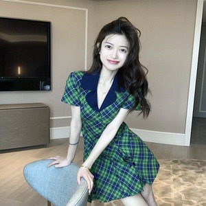 グリーン格子柄ドレス サマーVネックウェストスカート スタイルショート 大人ガーリー スウィート キュート カジュアル 夏物 Xiaofeijia11401336800