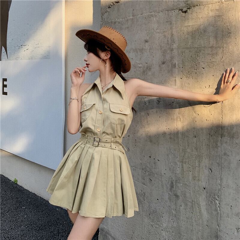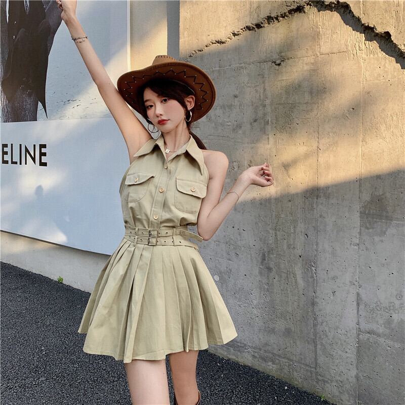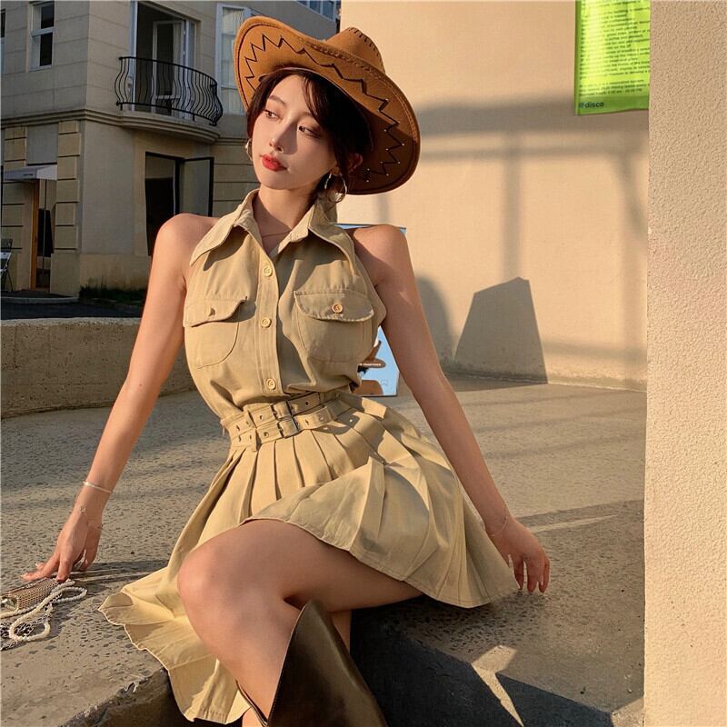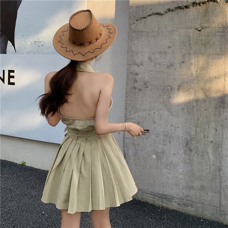 スタンダードホルターショートウェストスリムプリーツスカート レトロ Xiaofeijia91118109484