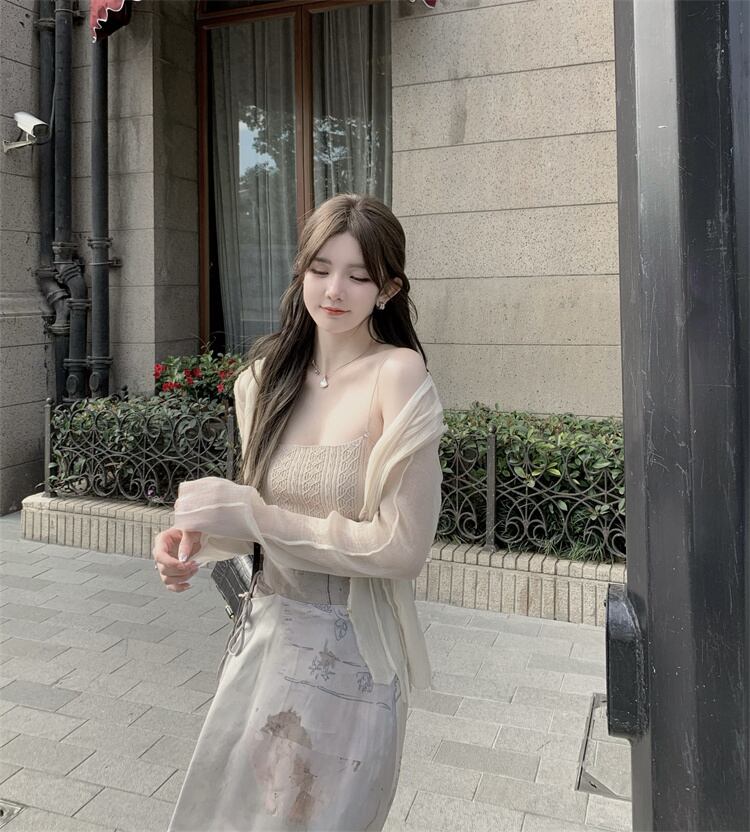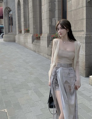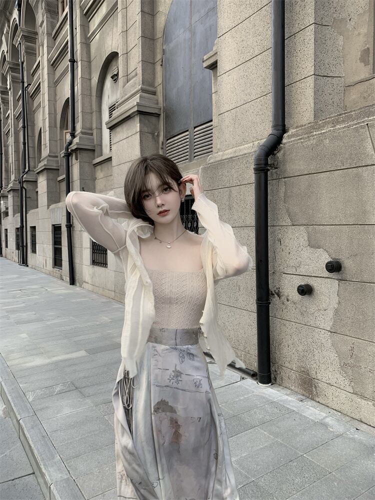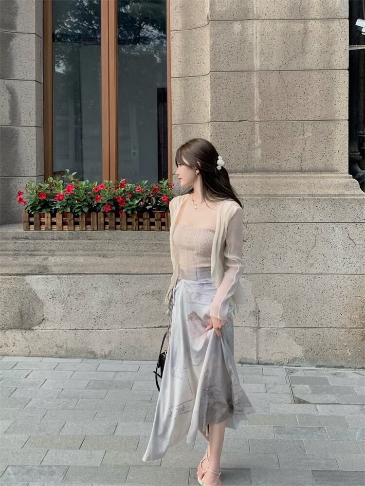 サマーシフォンカーディガンニットハイウェストプリント柄スカート 夏物 Xiaofeijia5090475357