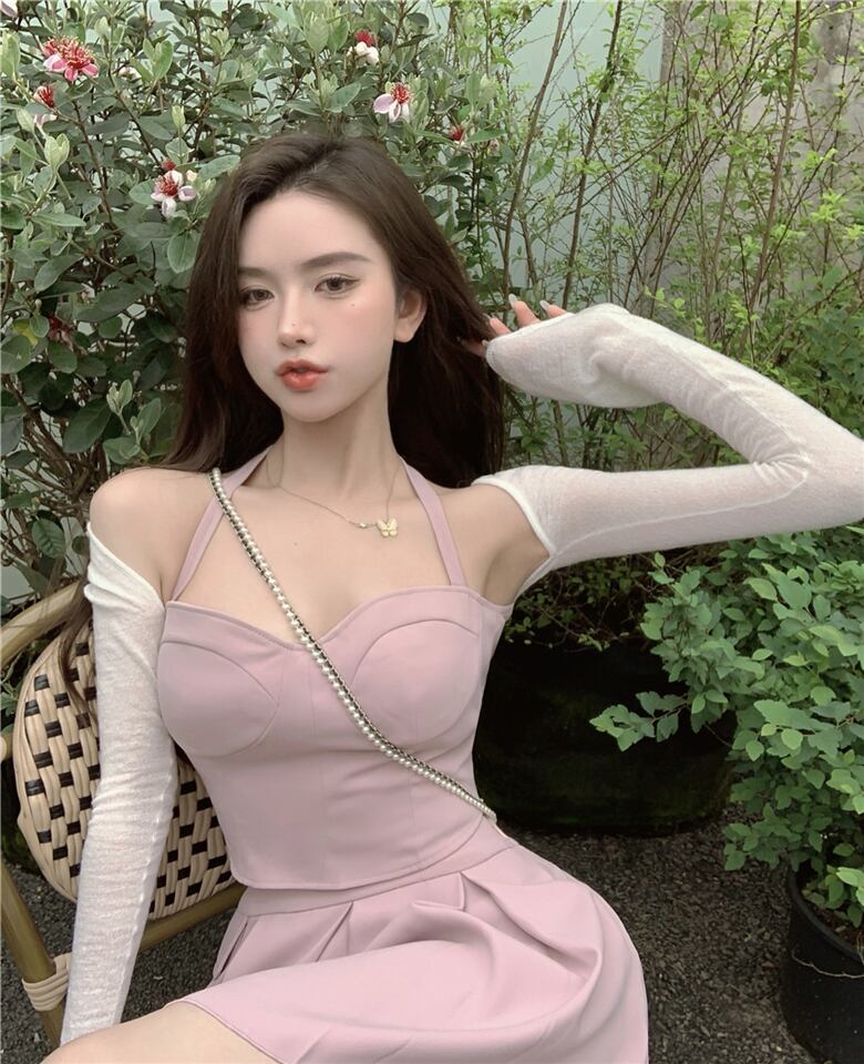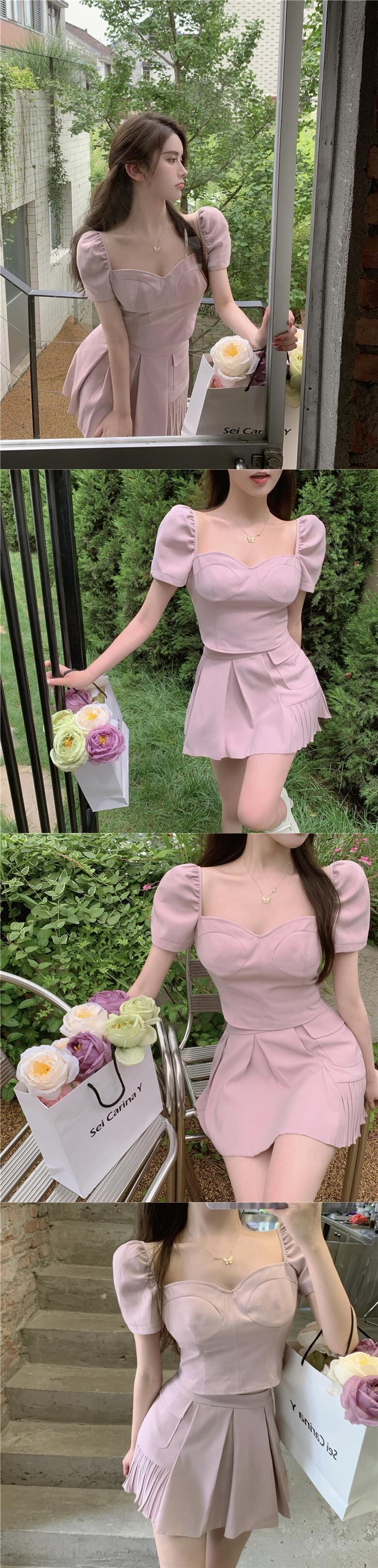 ドレス サマーバンドホルター半袖スリーブトップス プリーツ ショート ピンク ハーフスリーブ 夏物 Xiaofeijia53870559611
