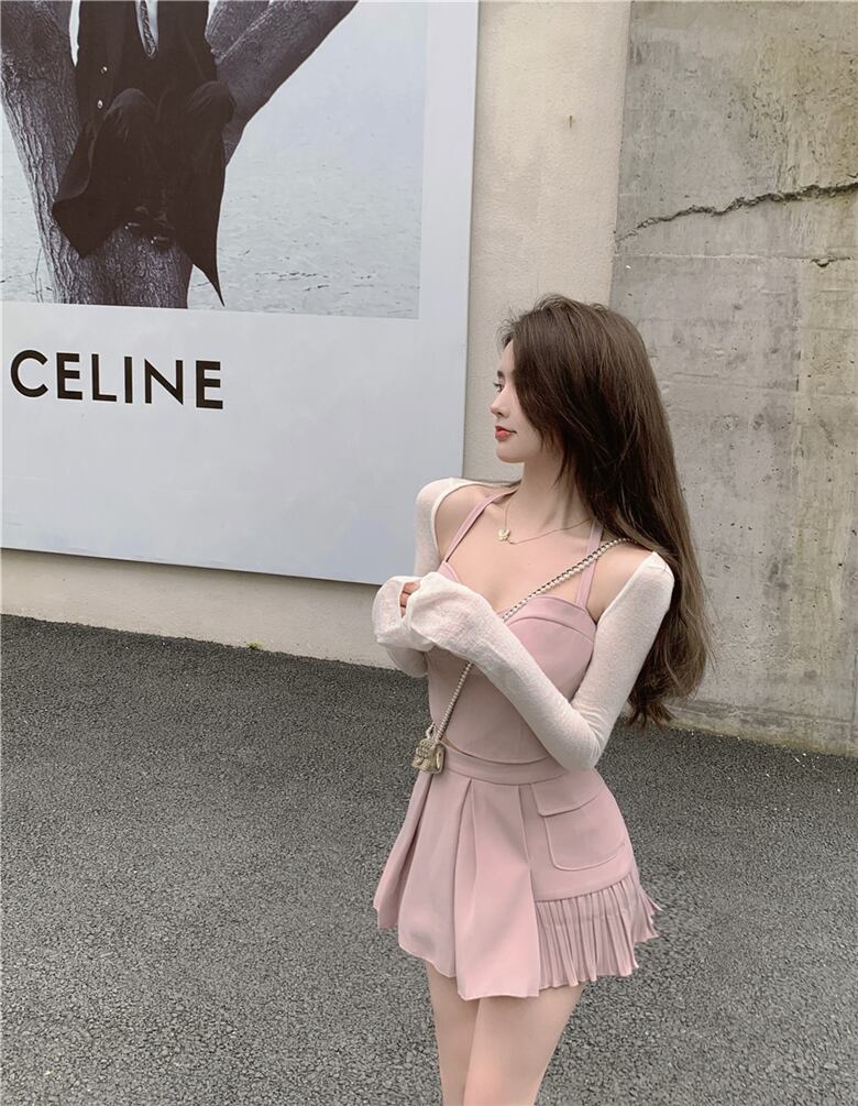 色:ピンクのサスペンダー,ピンクの半袖,ピンクのスカート,白いショール