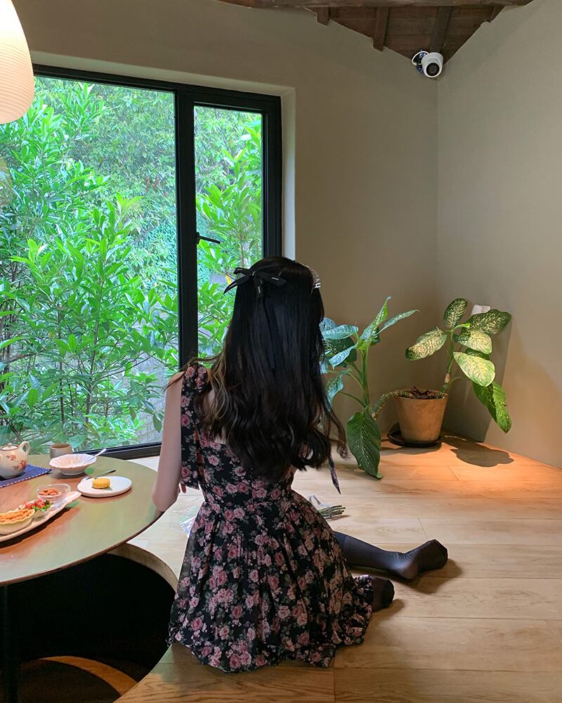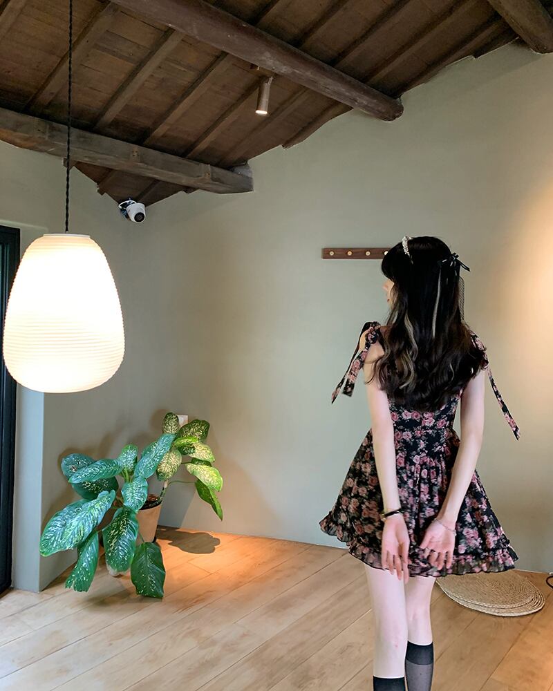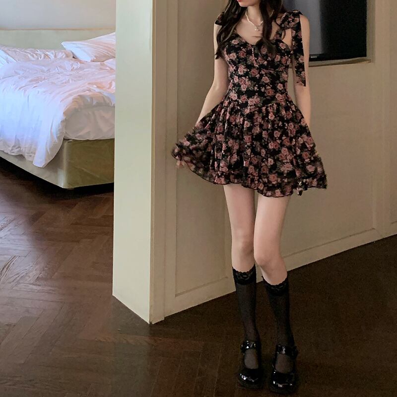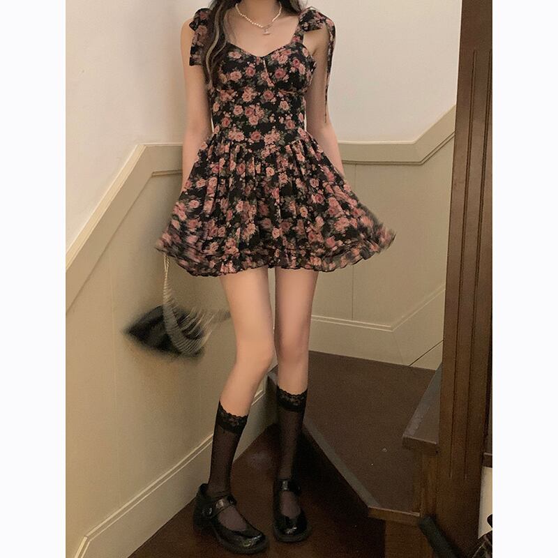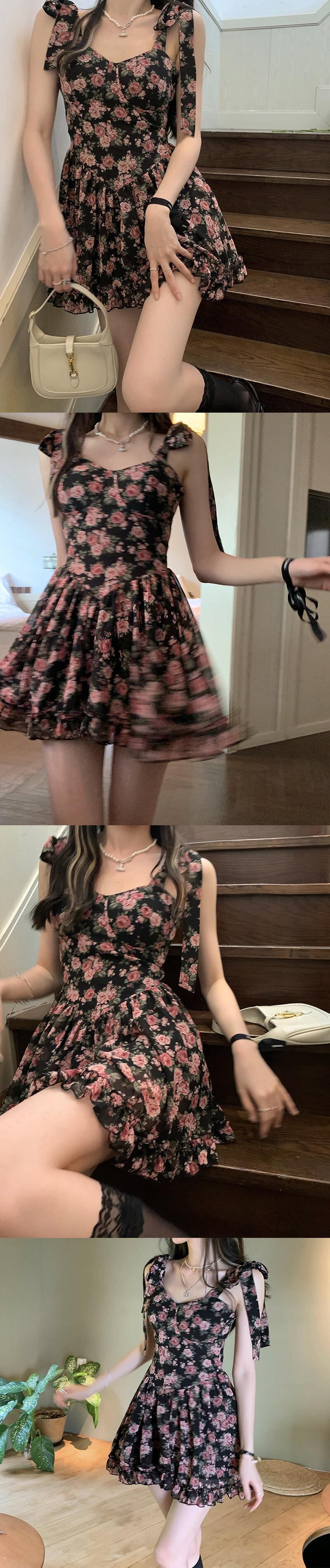 タンクトップトップス ドレス 薄手ウェストプリーツフローラルショートスカート レース 花柄 レースアップ Xiaofeijia3393975053