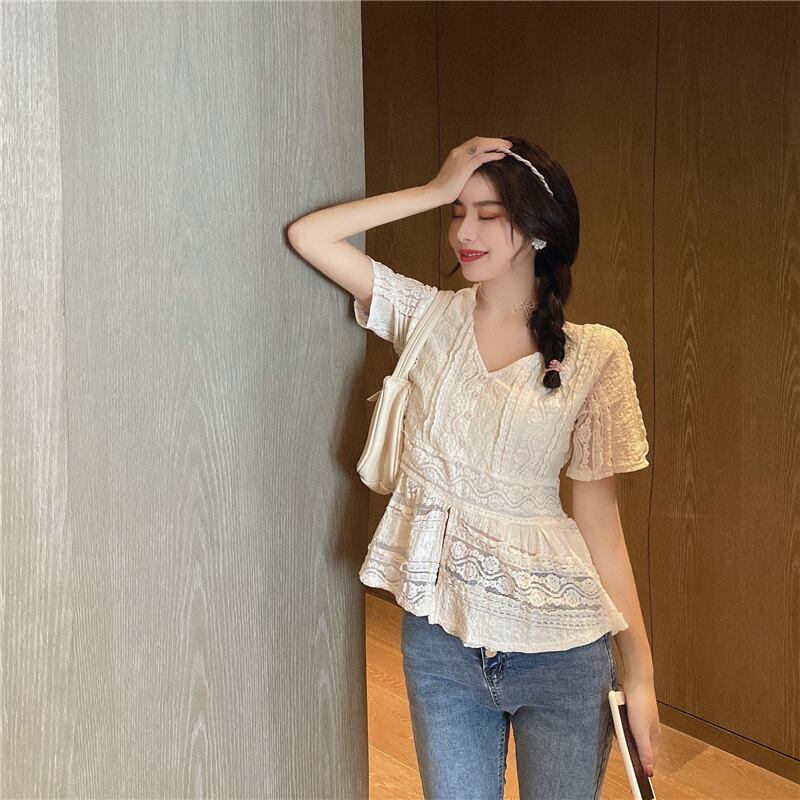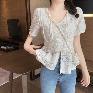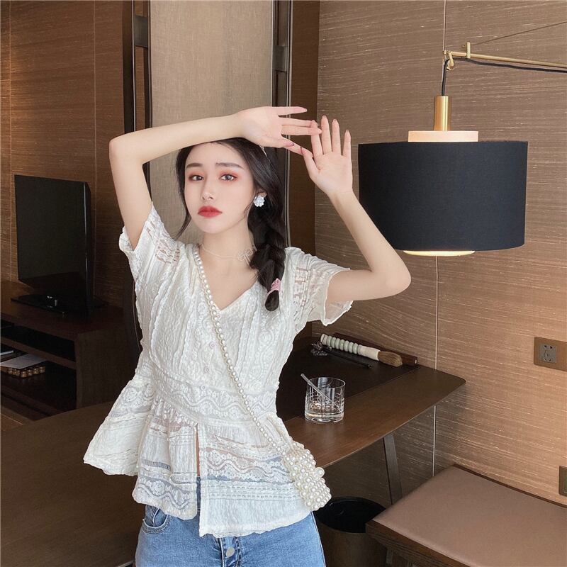 Vネックレースブラウス レディースサマーシャツ ウェスト 夏物 Xiaofeijia54334033783