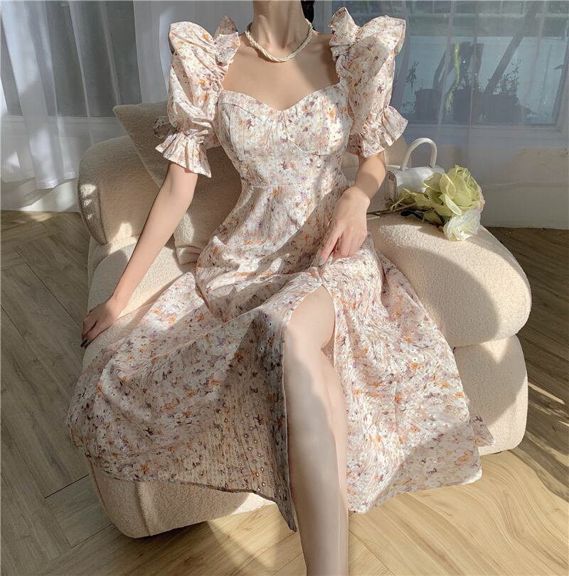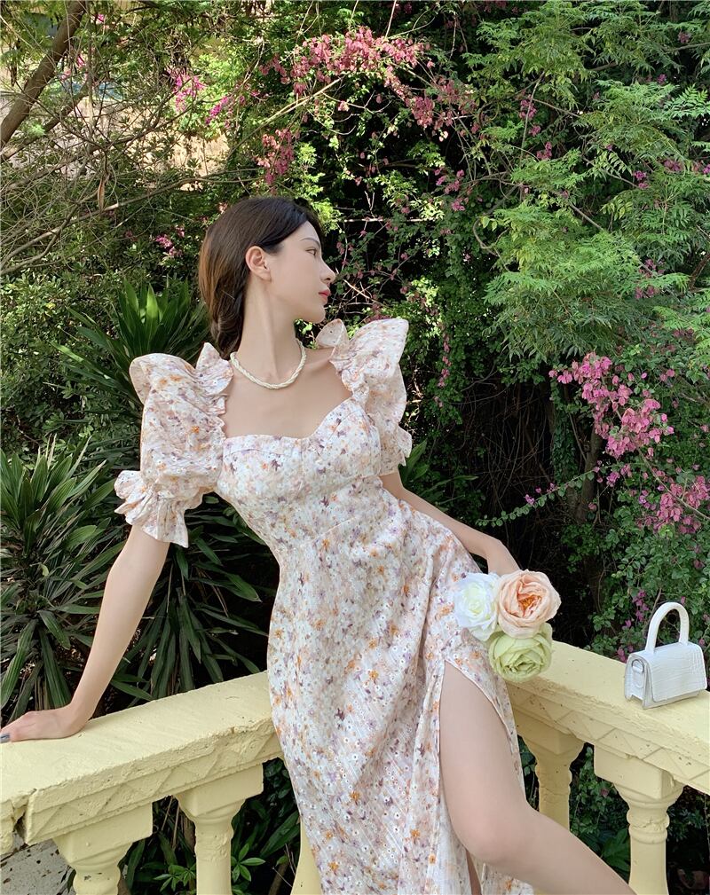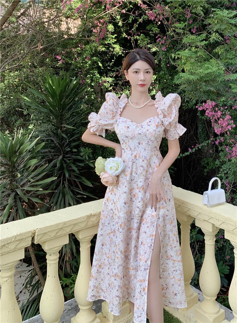 スタンダードスリーブフローラルドレス ウェストスリットスカート レトロ 花柄 Xiaofeijia61582841552