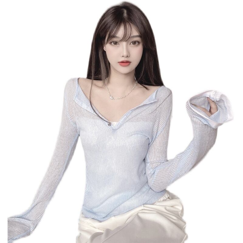 ニットセーター サマー薄手プルオーバー シャツ Vネックトップス ロング 夏物 シルク Xiaofeijia78637327014