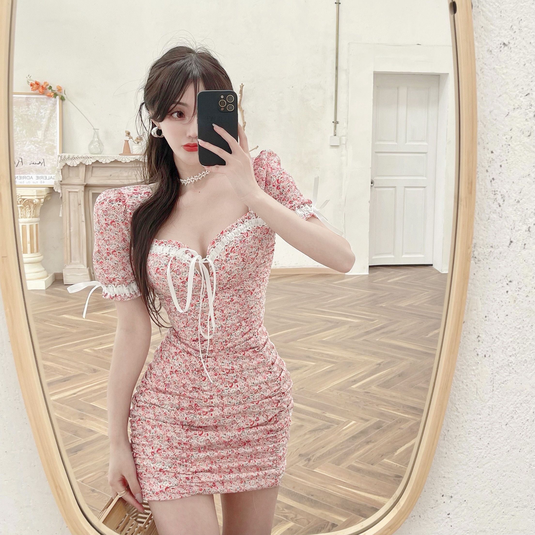 サマースリーブフローラルウェスト薄手スカート レッド 夏物 花柄 Xiaofeijia20880414272