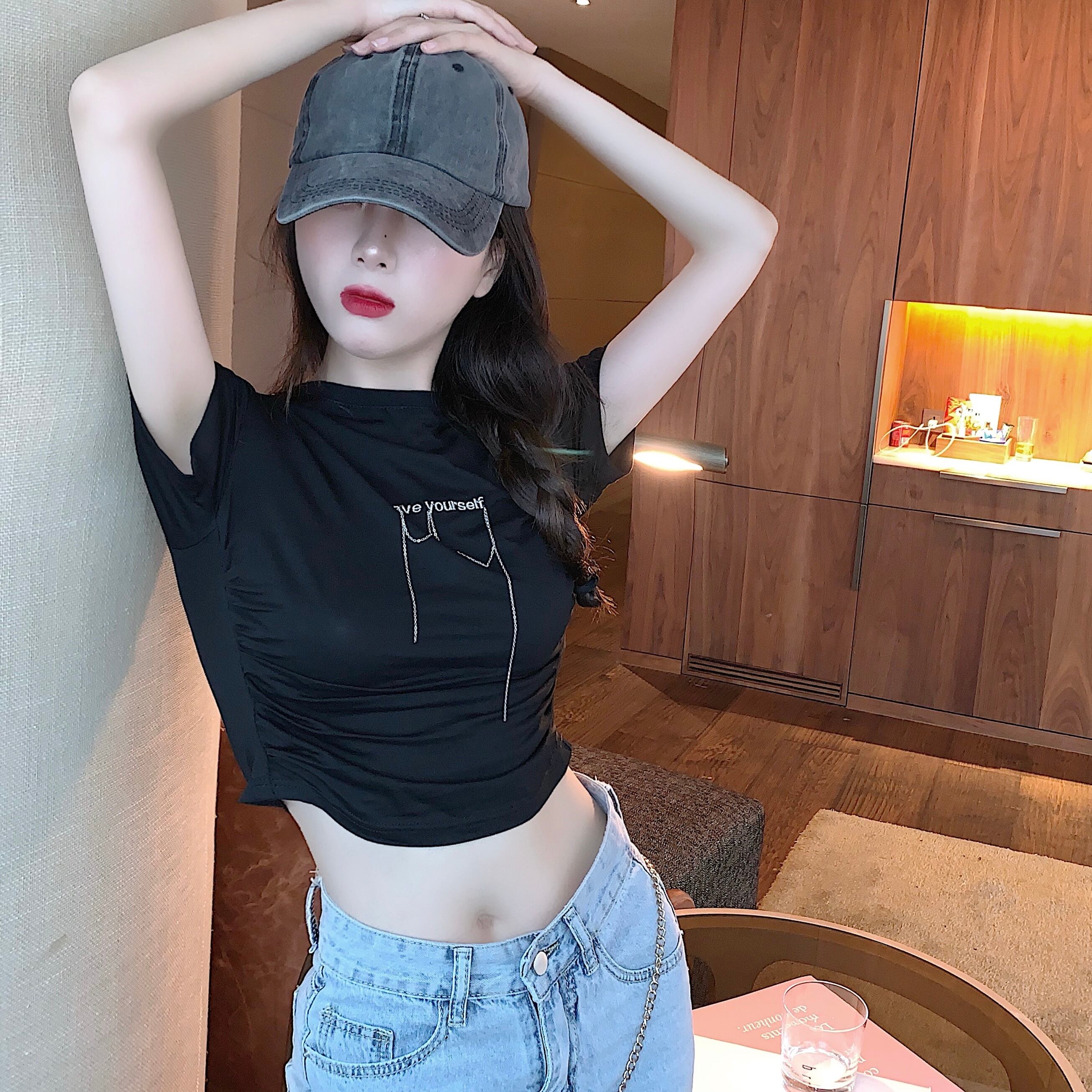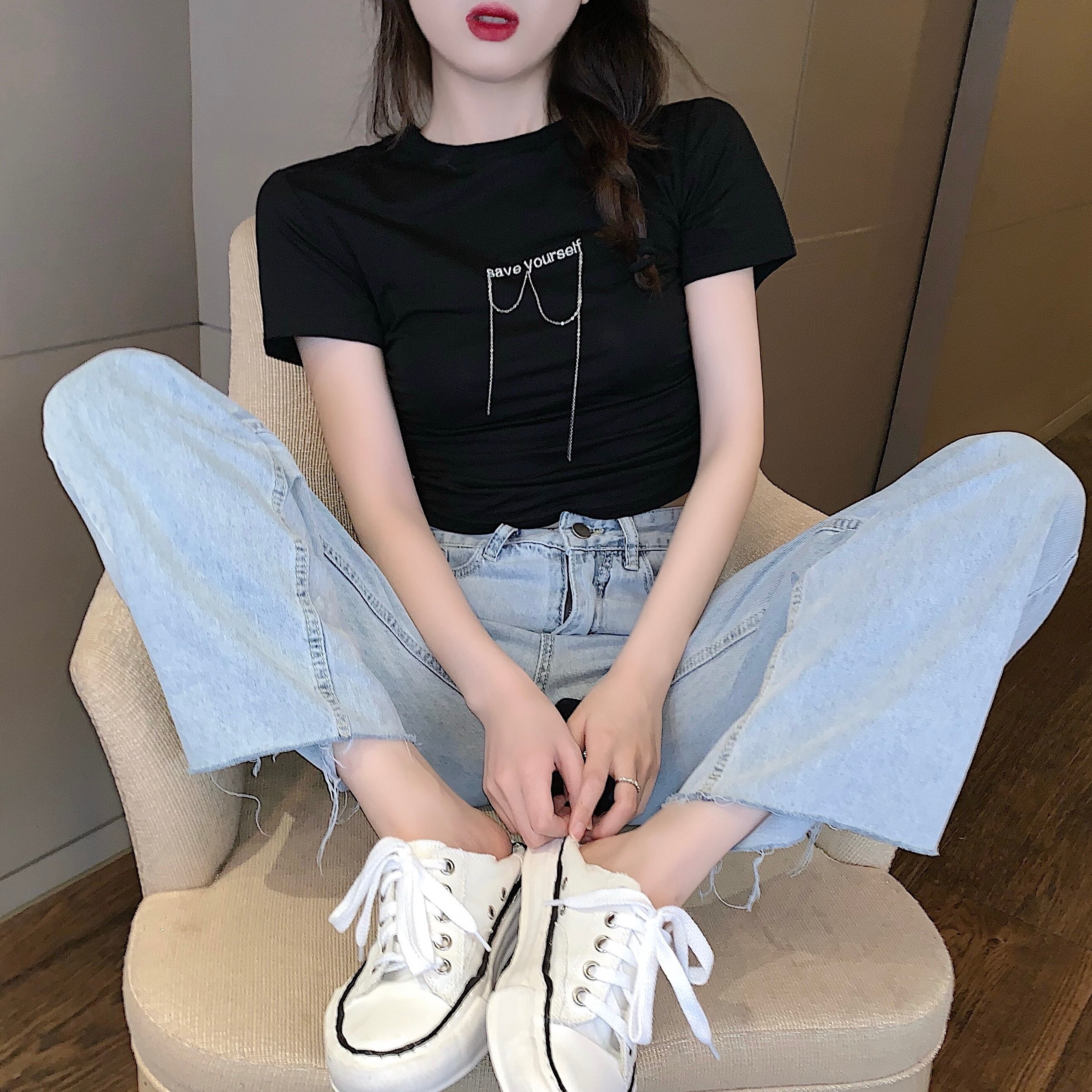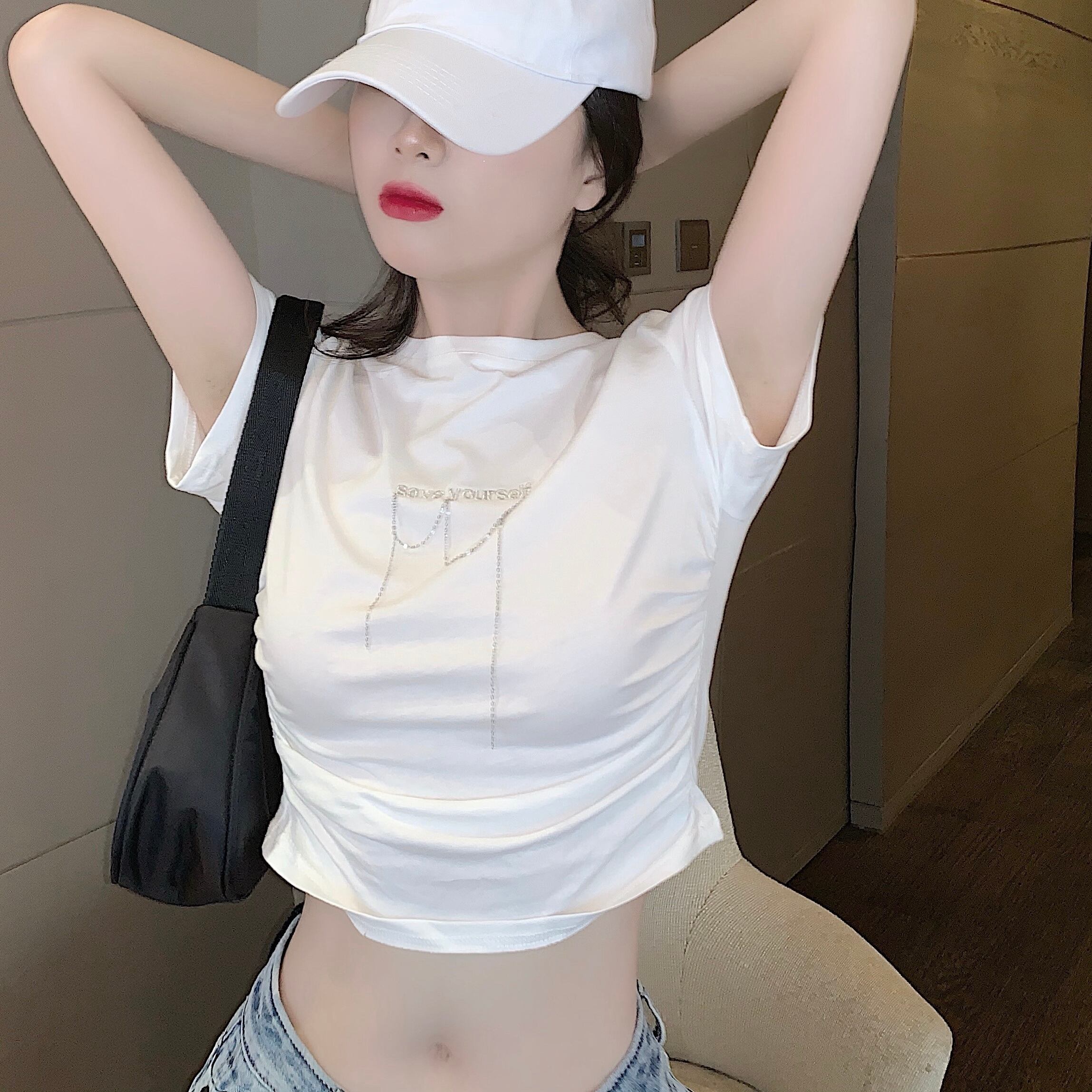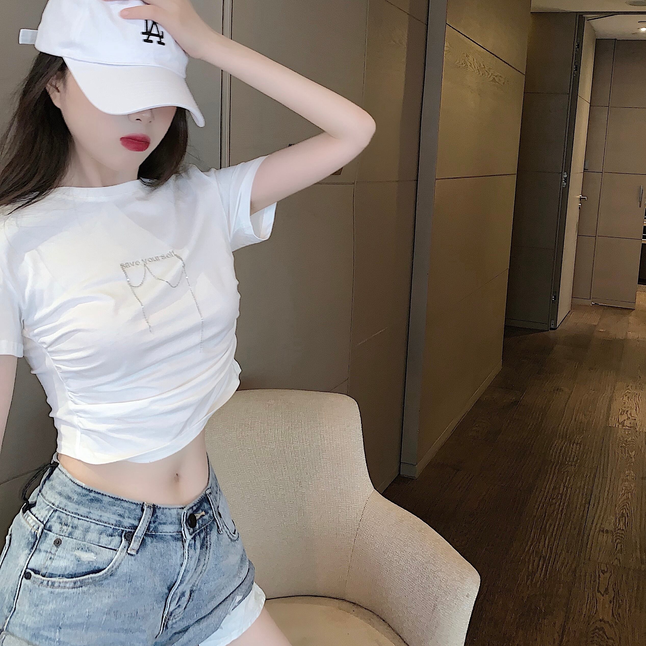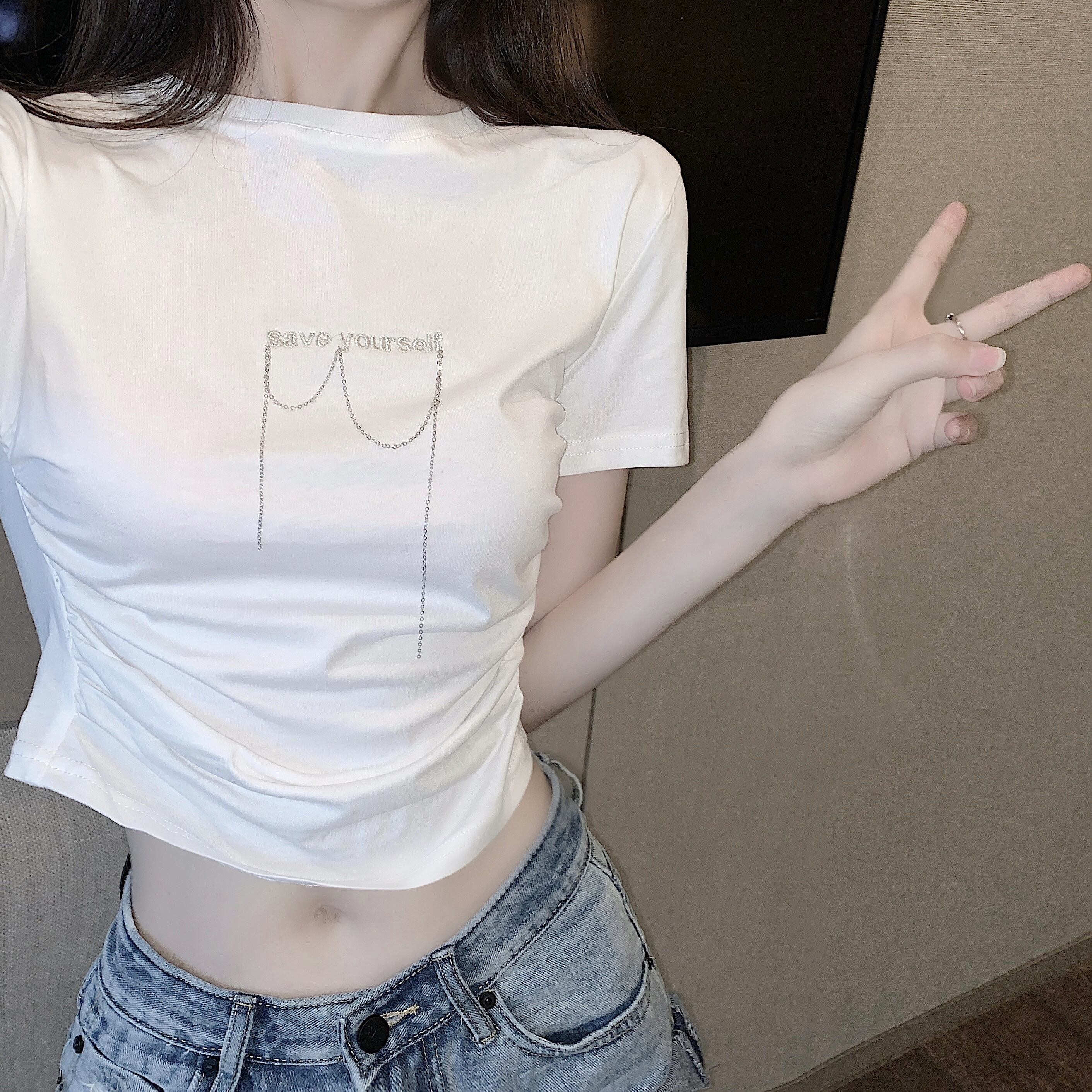スプリングサマースタイルスリムハイウェストショートTシャツ ラインストーントップス 春物 夏物 Xiaofeijia17070400951