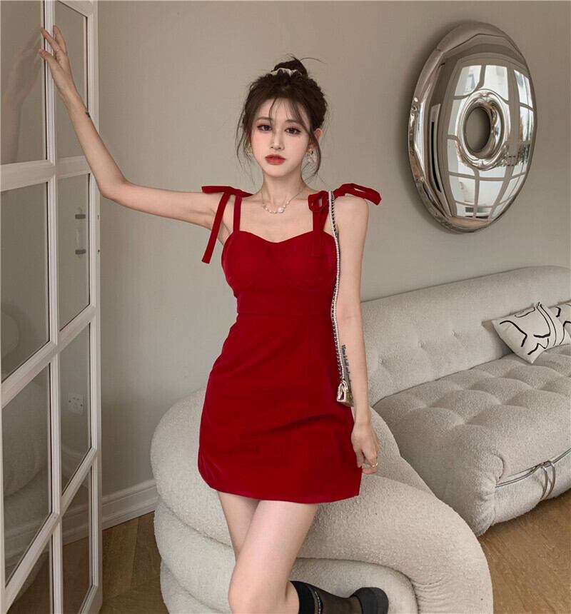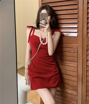 ホワイトスタンダードリボンウェストレッドドレス レトロ Xiaofeijia28279328583