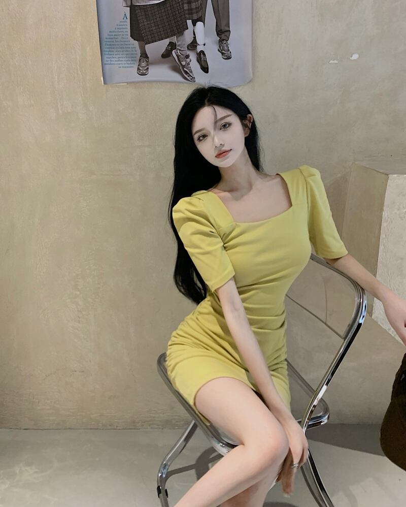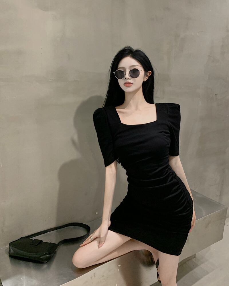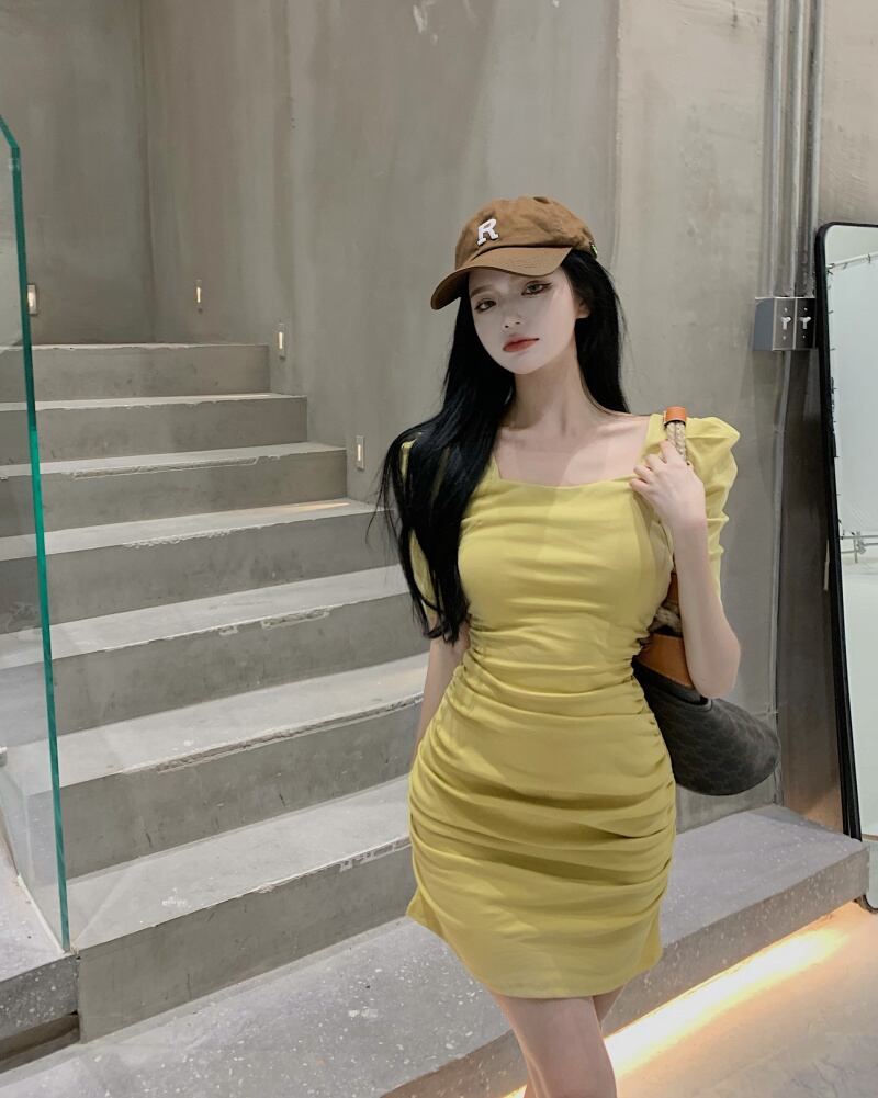サマースタンダードプリーツスリーブドレス スタイルショートスカート レトロ 夏物 スクウェア Xiaofeijia54358473663