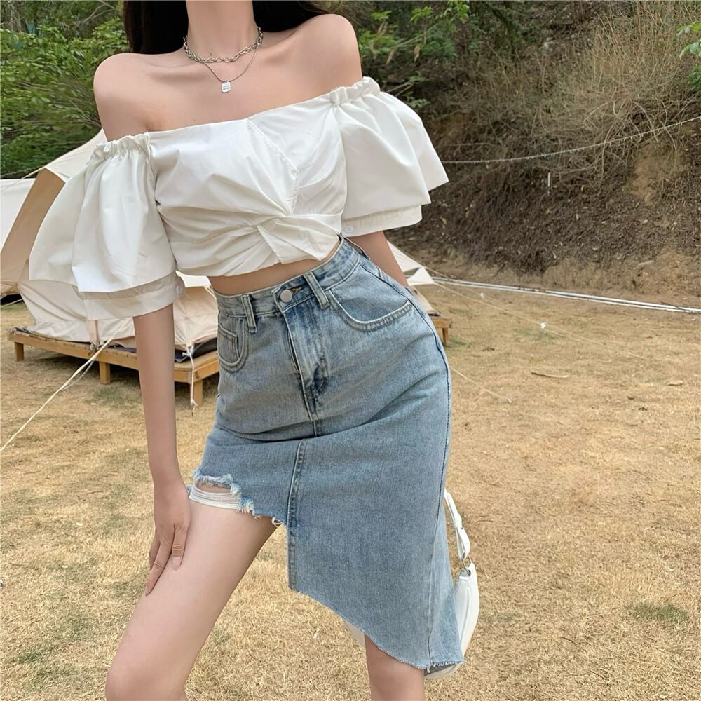 リボンホルターショートシャツ ハイウェストスカート サマー ストリート 夏物 Xiaofeijia76509929961