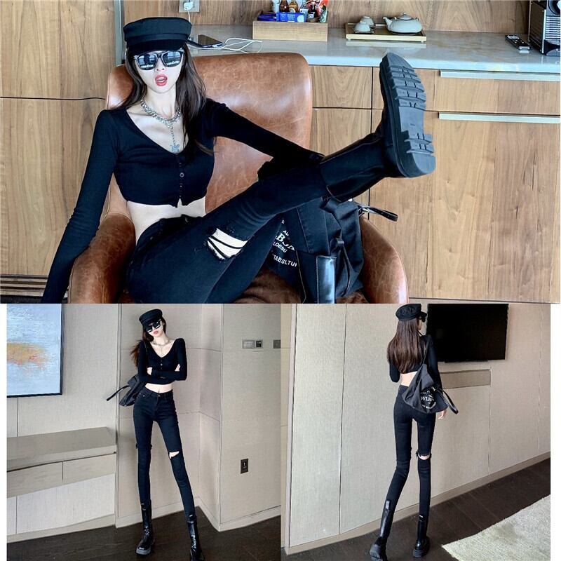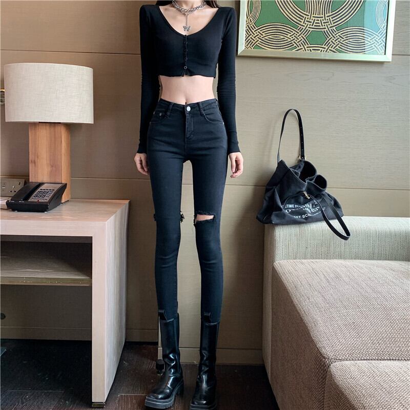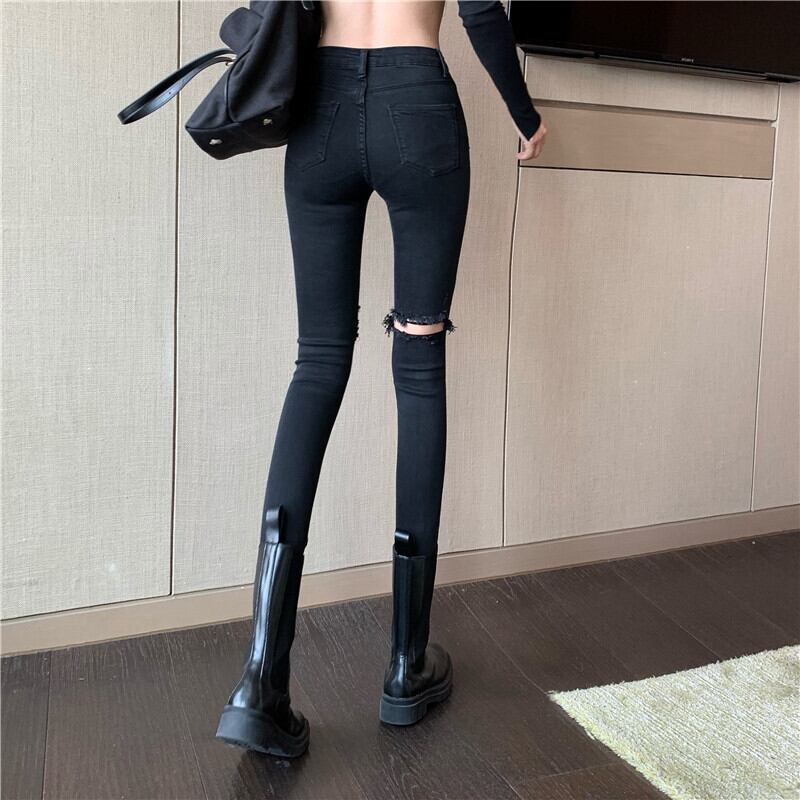 ウェストジーンズ レディーススリムパンツ ブラック Xiaofeijia98382766840