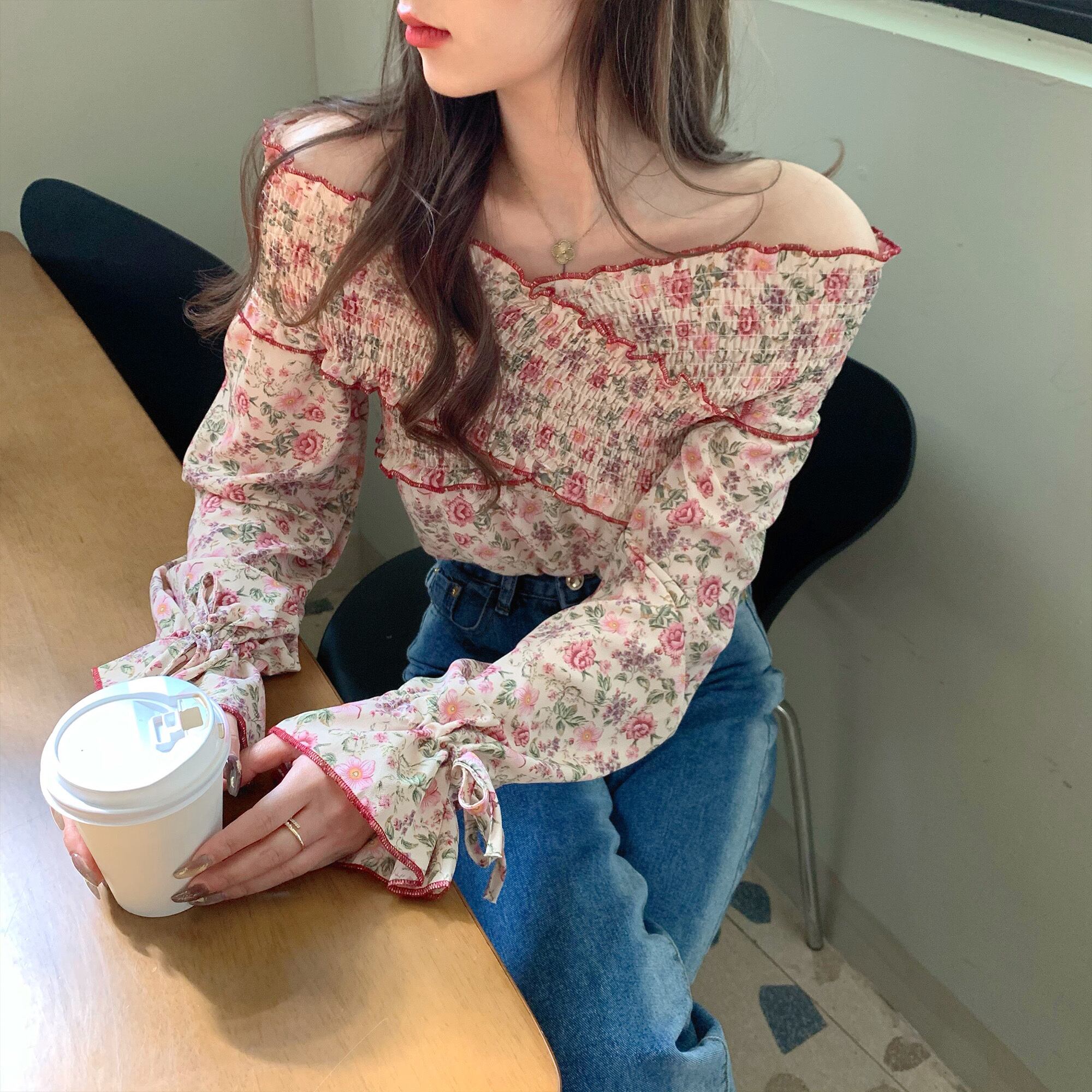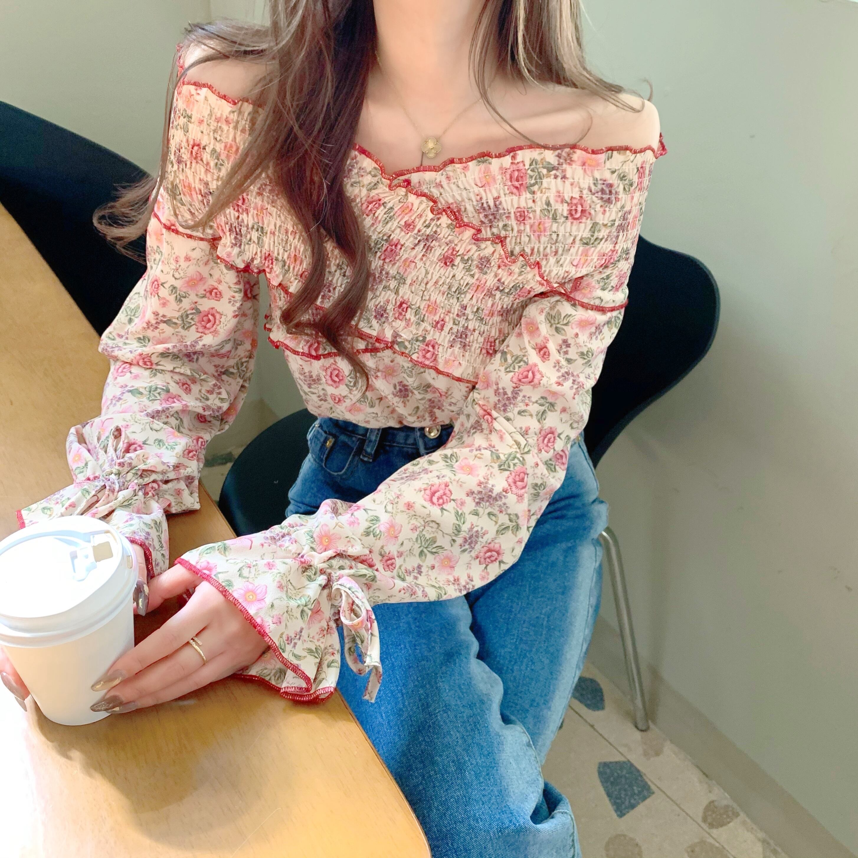 スプリングシフォンシャツ スタイル薄手プリーツフローラルトップス ロング 春物 花柄 Xiaofeijia65560324180