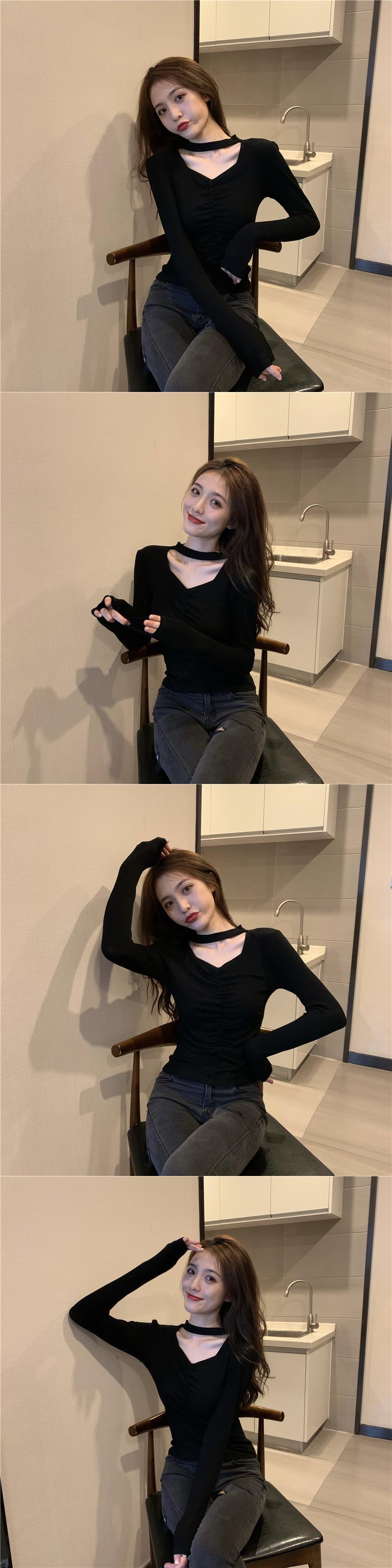 スプリングホルターVネックプリーツTシャツ シャツ スリムショートトップス ロング 春物 Xiaofeijia82960732401