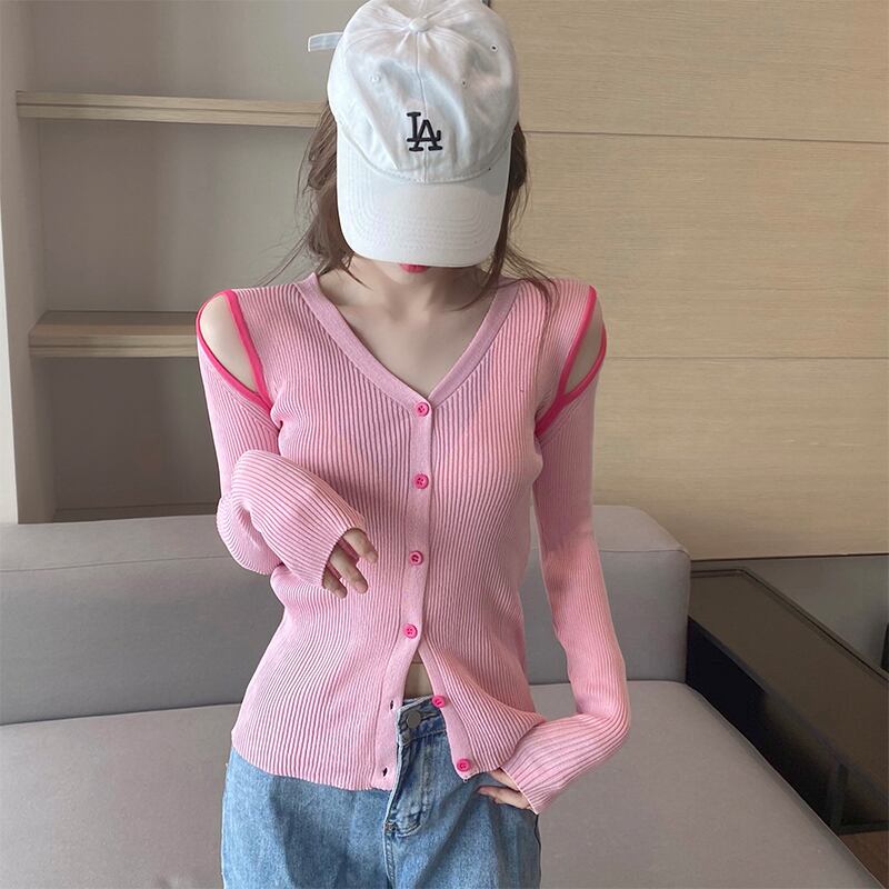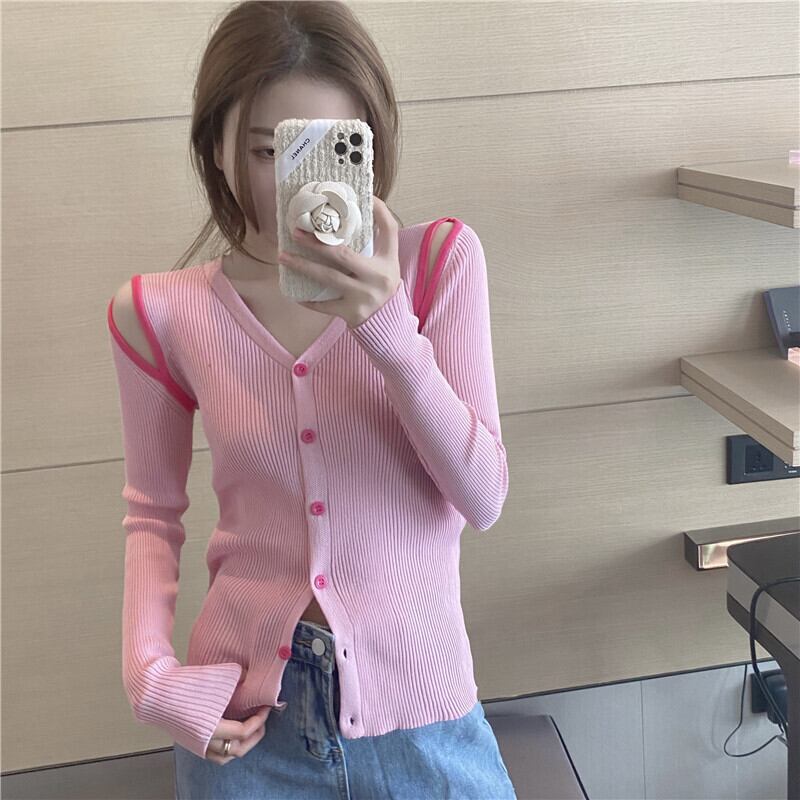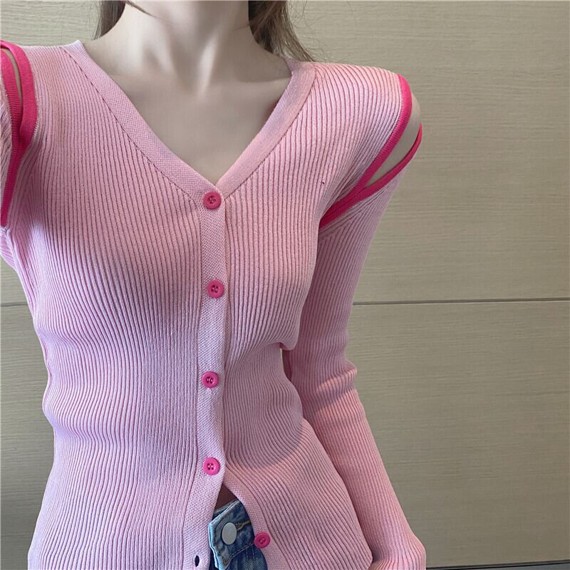 カーディガンスプリングストラップレスVネックトップス シャツ ブレストセーター ロング 春物 Xiaofeijia83729174994