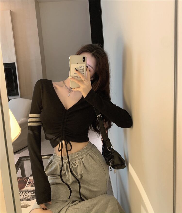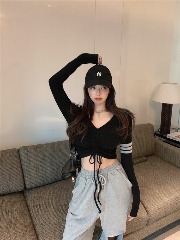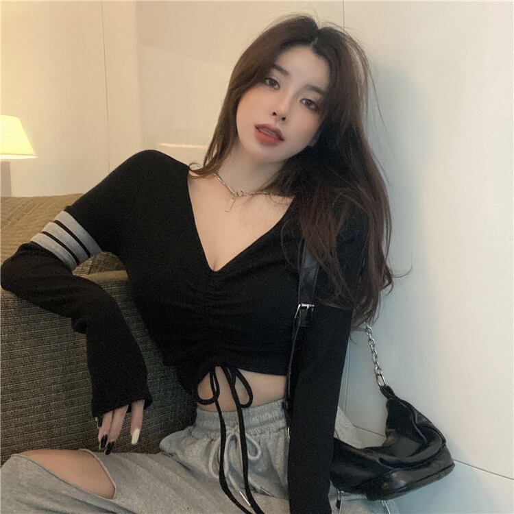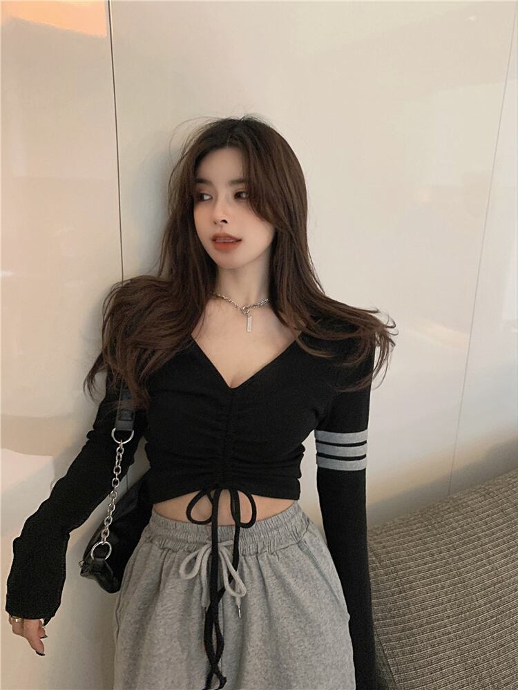 スプリングスリムショートギャザーVネックTシャツ シャツ ストライププリーツトップス ロング 春物 Xiaofeijia90810902095