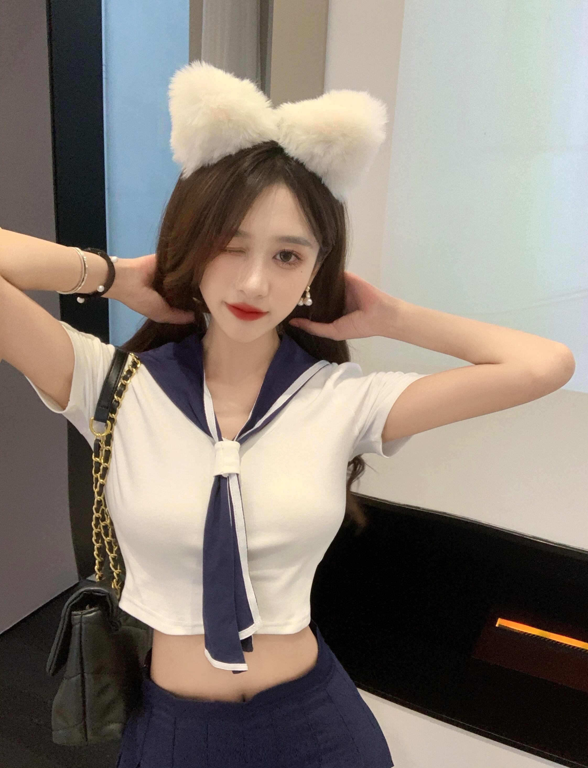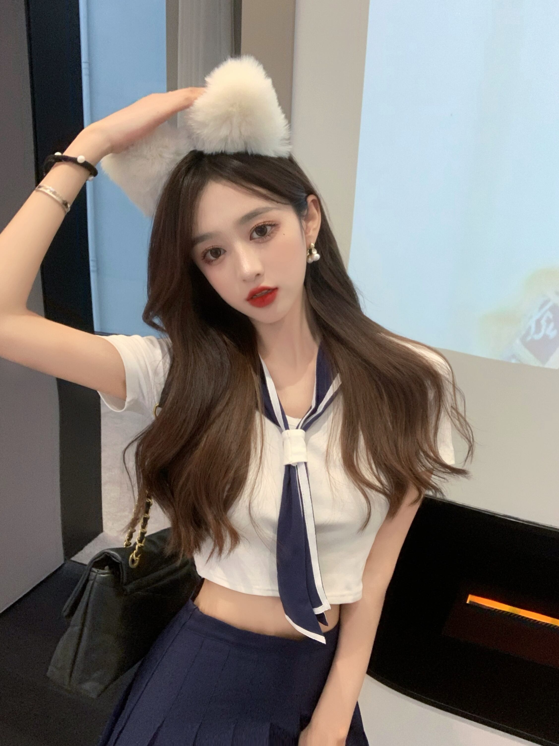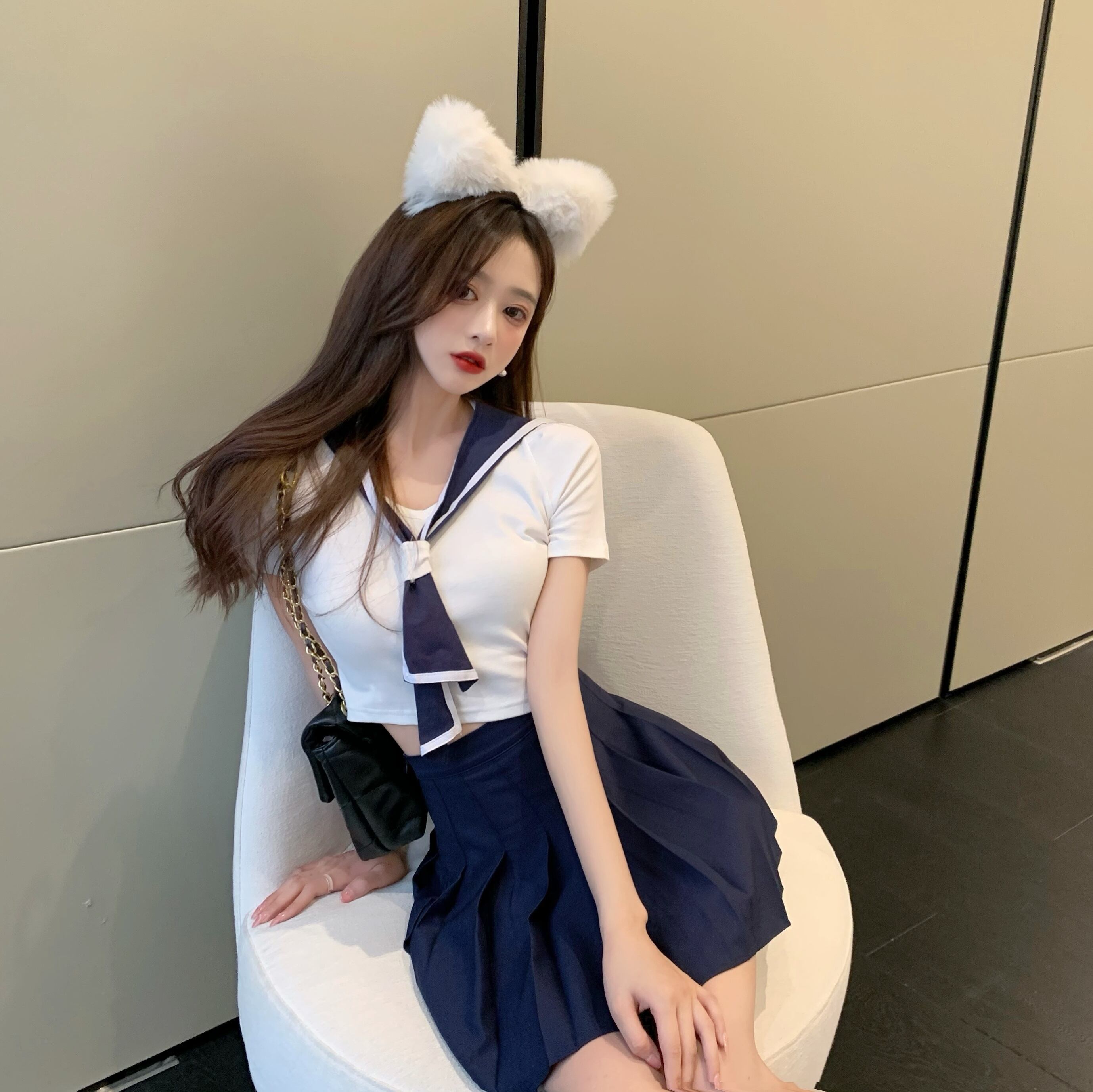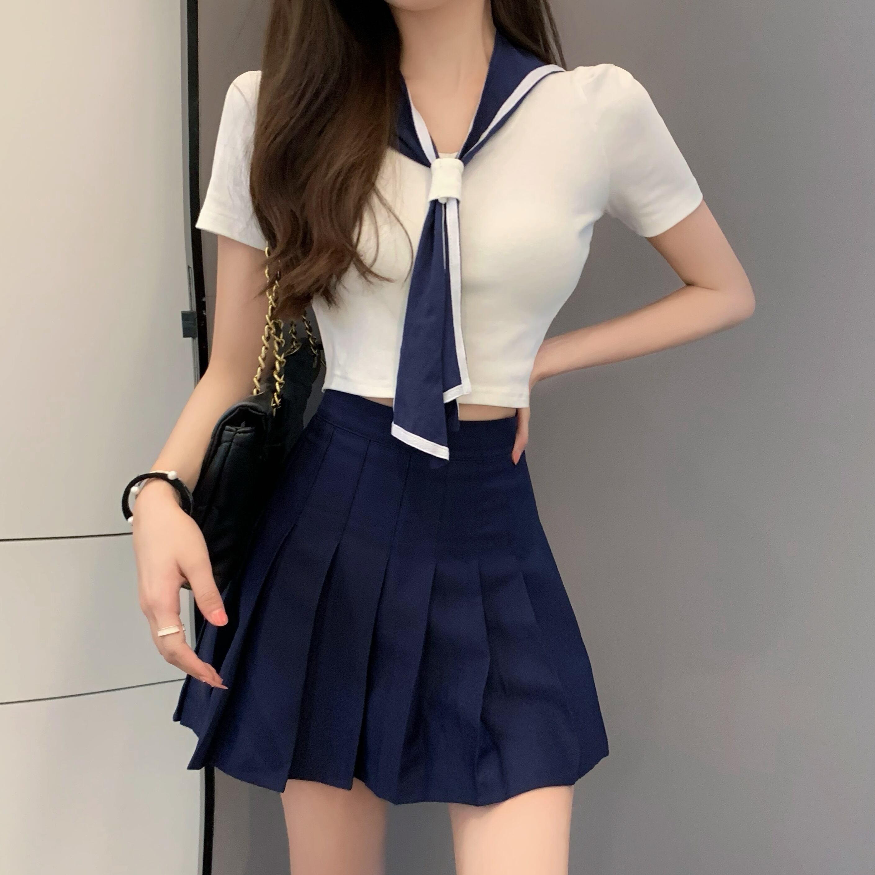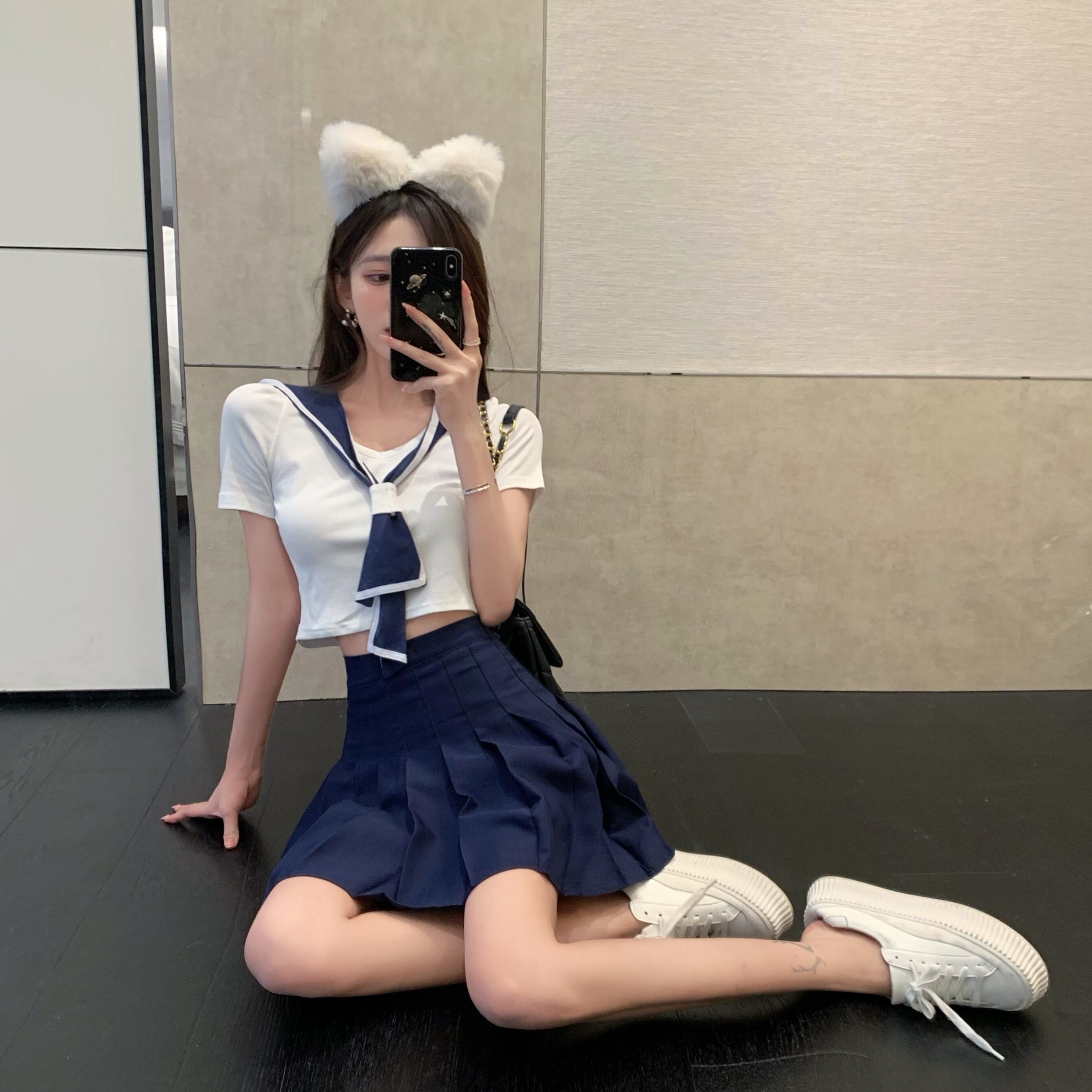 スタイルFlowerデザイン サマーショートネイビーカラートップス プリーツスカート 大人ガーリー スウィート キュート カジュアル 夏物 フラワーデザイン Xiaofeijia24762991861
