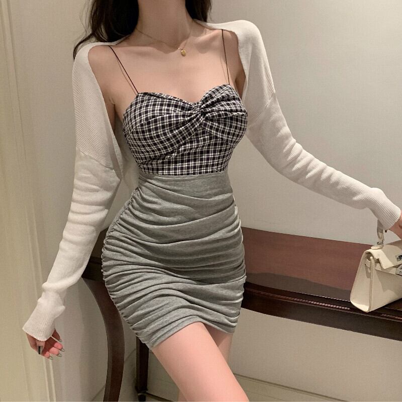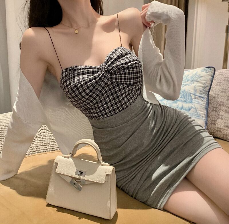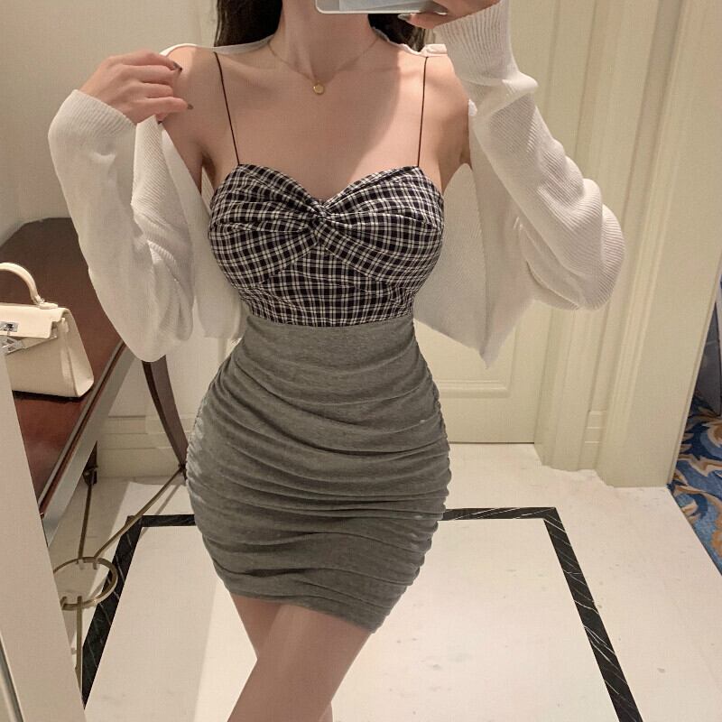 トップス 格子柄プリーツドレス サマー薄手スカート 夏物 ステッチ Xiaofeijia38831079284
