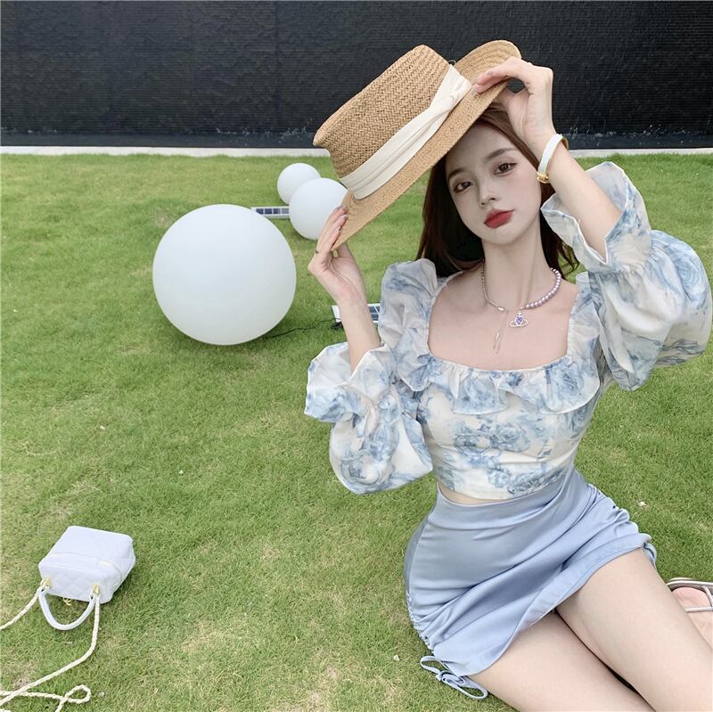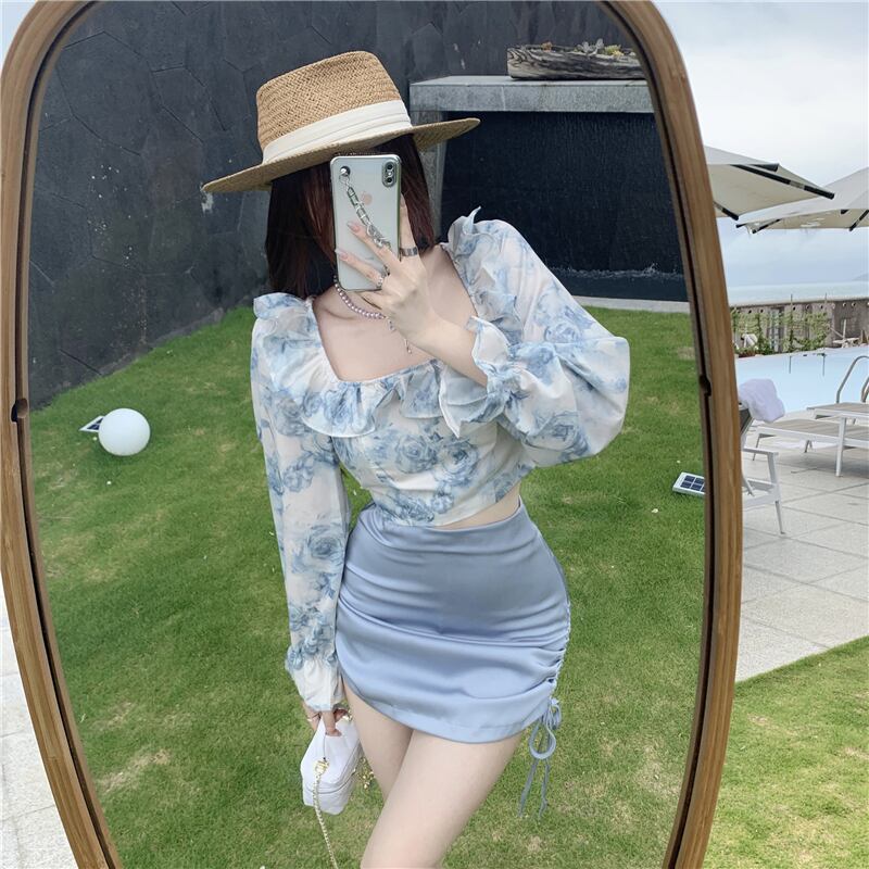 スタイルスカート カラーフローラルシフォンシャツ サテンギャザーサマー 夏物 花柄 Xiaofeijia92557075497