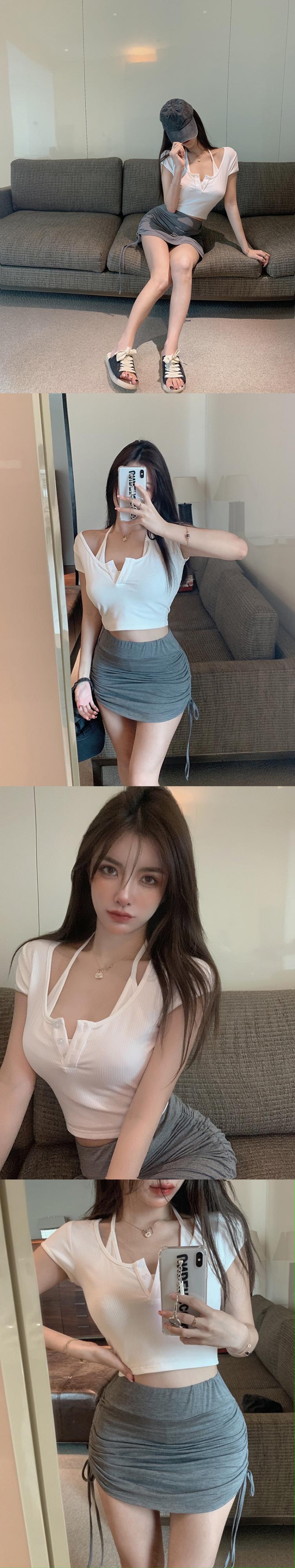 ボタンカラーショートTシャツ レディースサマートップス 夏物 ステッチ Xiaofeijia66037069400