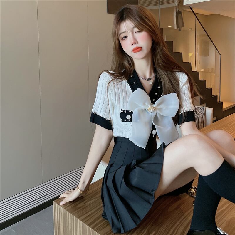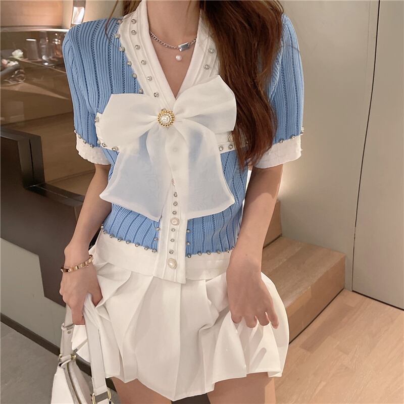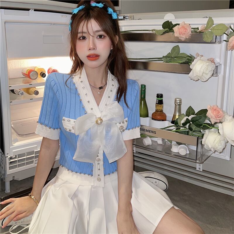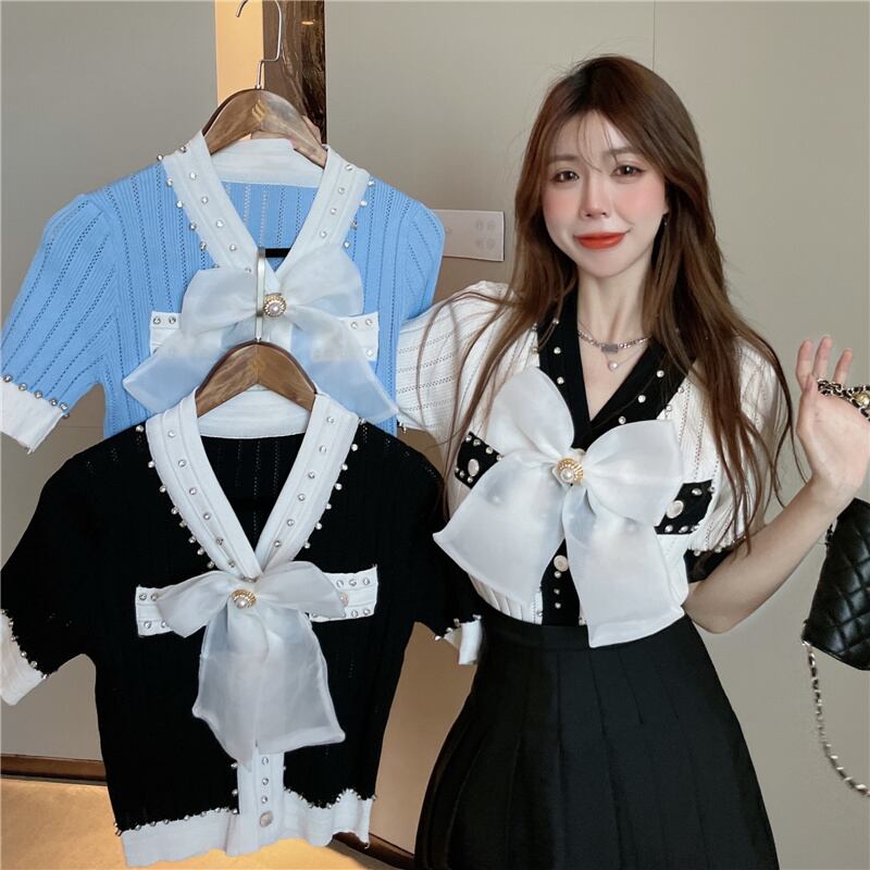 セーター ショートVネックリボンカラージャケット 薄手サマー 大人ガーリー スウィート キュート カジュアル 夏物 シルク Xiaofeijia77621851860