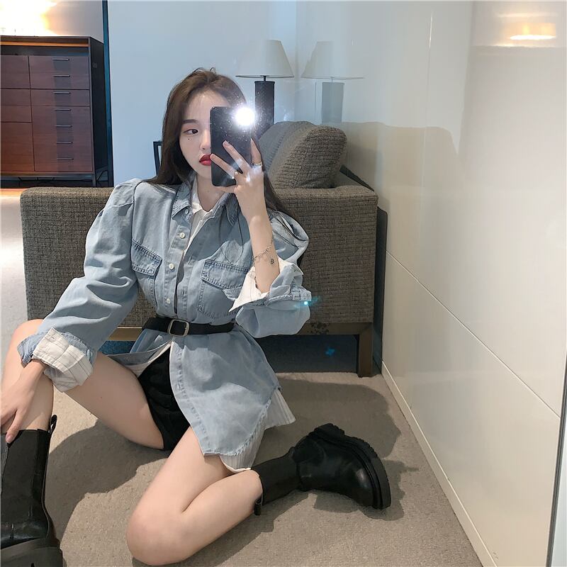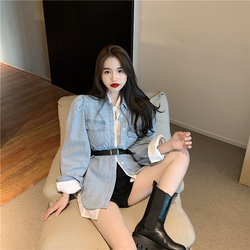 スタンダードスリーブジャケット オータムストライプルーズシャツ ロング レトロ 秋物 Xiaofeijia52510689795