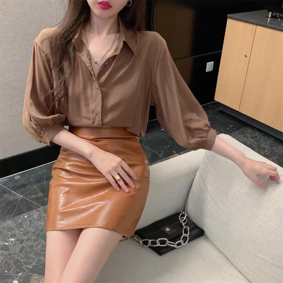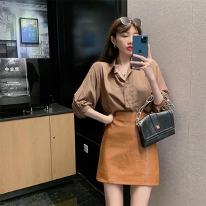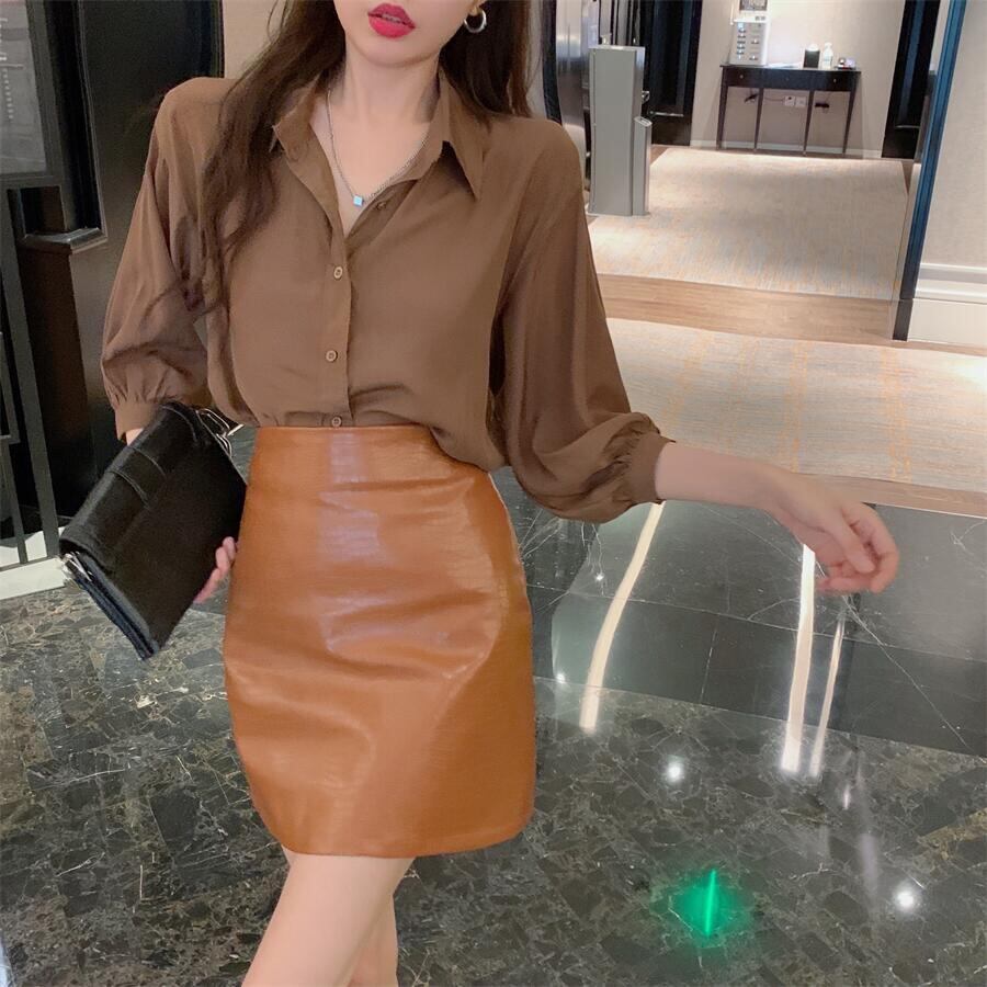 スタイルスタンダードルーズカーキシャツ オータムハイウェストウェストレザースカート レトロ 秋物 Xiaofeijia21896313777