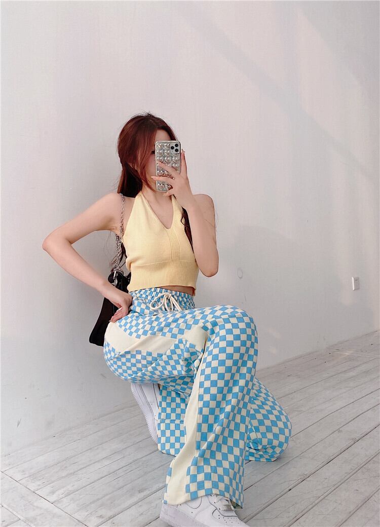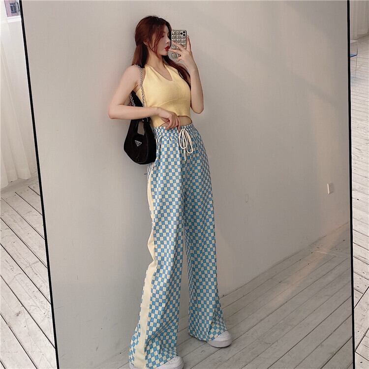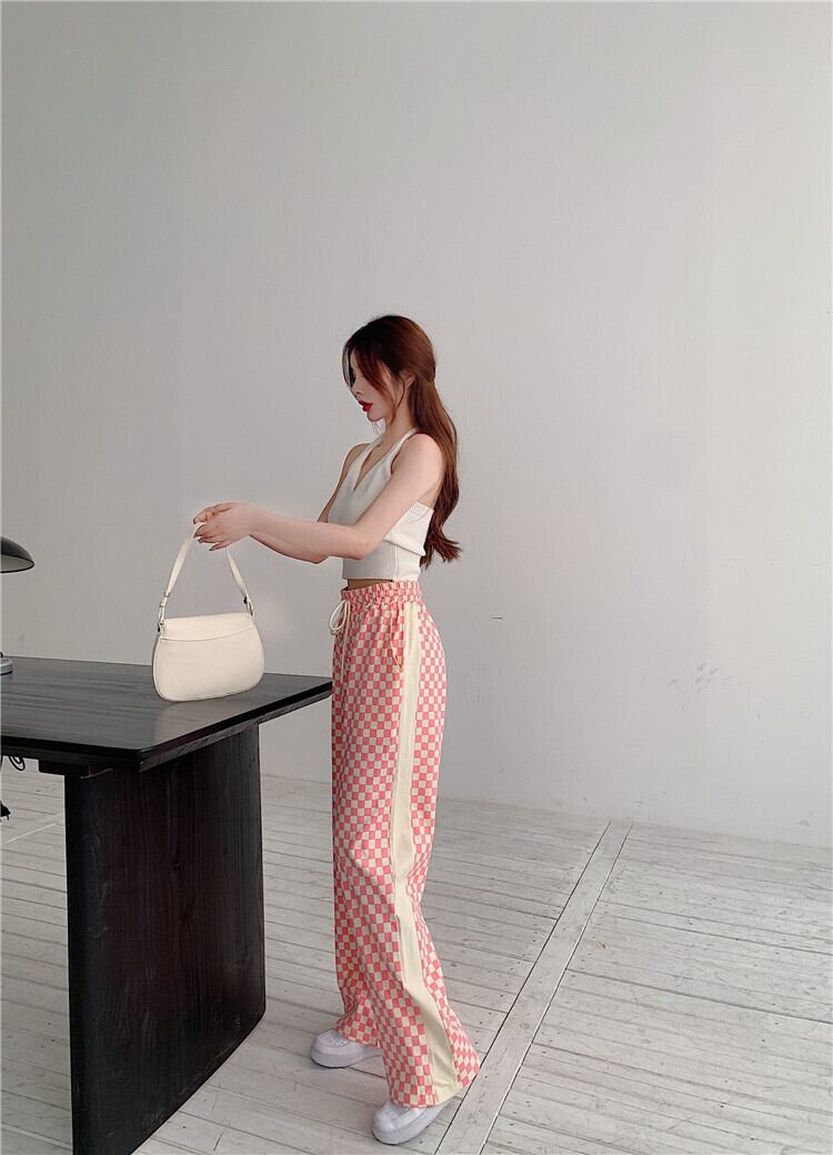 ハイウェストウェスト格子柄カジュアルサマーVネック 夏物 ステッチ Xiaofeijia90129362998