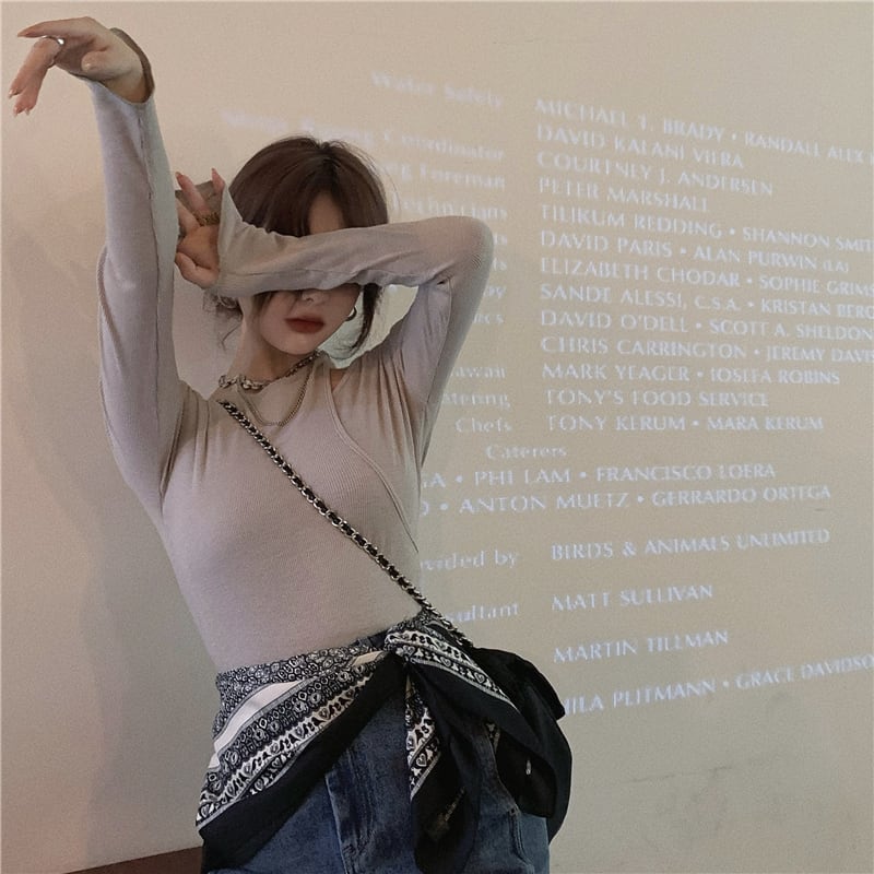 オータムTシャツ シャツ ラウンドネックスリムトップス ロング 秋物 Oネック オフショルダー Xiaofeijia28818783836