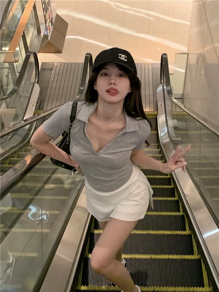 ショートシャツ Tシャツ サマースタイルVネックトップス 夏物 ヨーロピアン Xiaofeijia28518530403