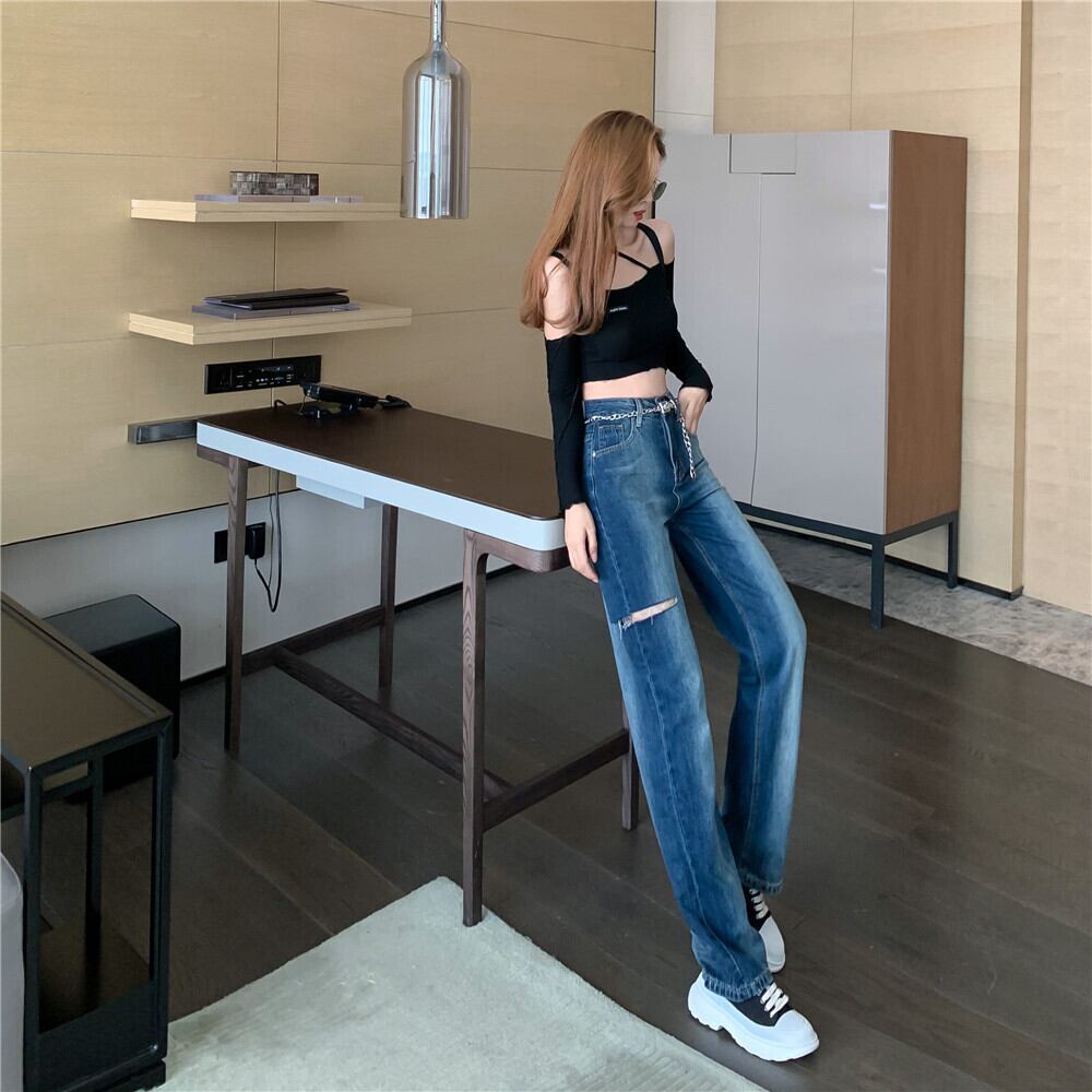ジーンズ レディースオータムルーズハイウェストウェストワイドレッグパンツ 薄手スタンダード レトロ 秋物 ワイドパンツ Xiaofeijia18263260688
