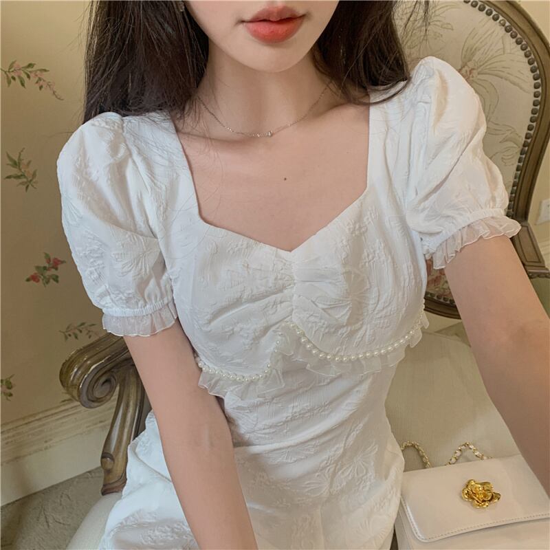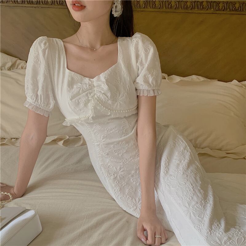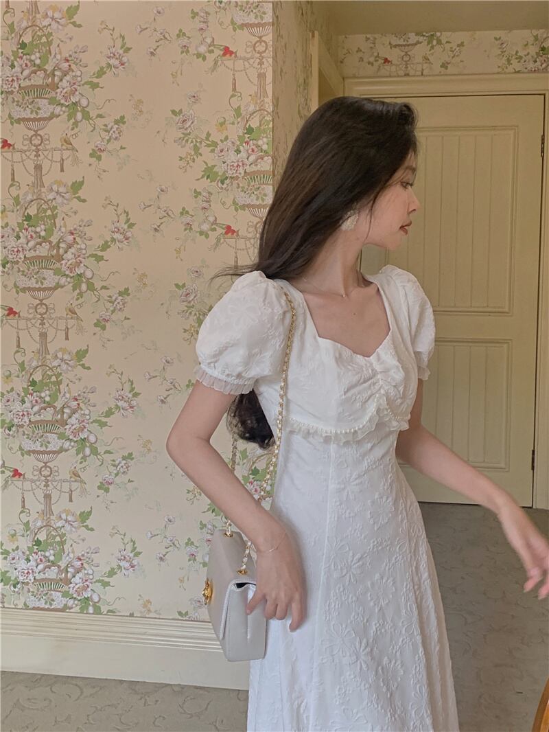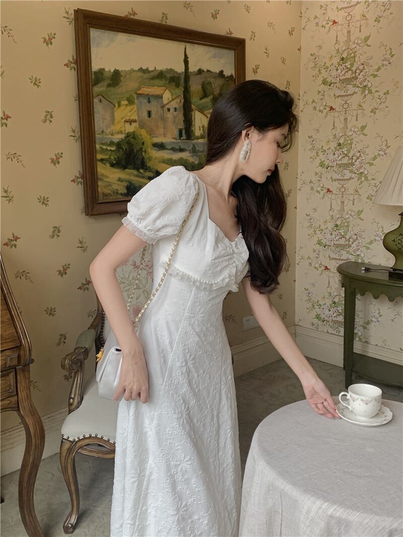 ホワイトスリーブドレス スタンダードスタイルスカート サマー レトロ レース 大人ガーリー スウィート キュート カジュアル 夏物 Xiaofeijia76041639652