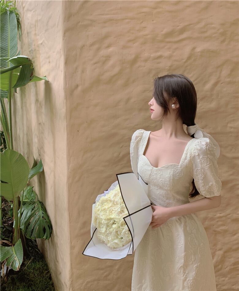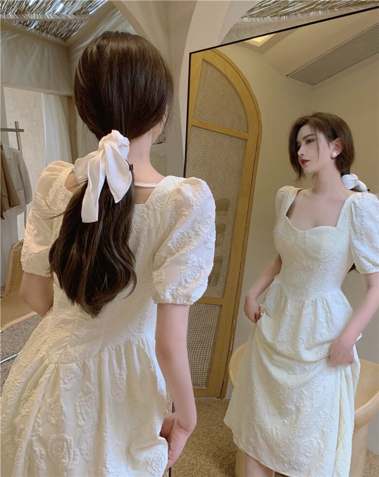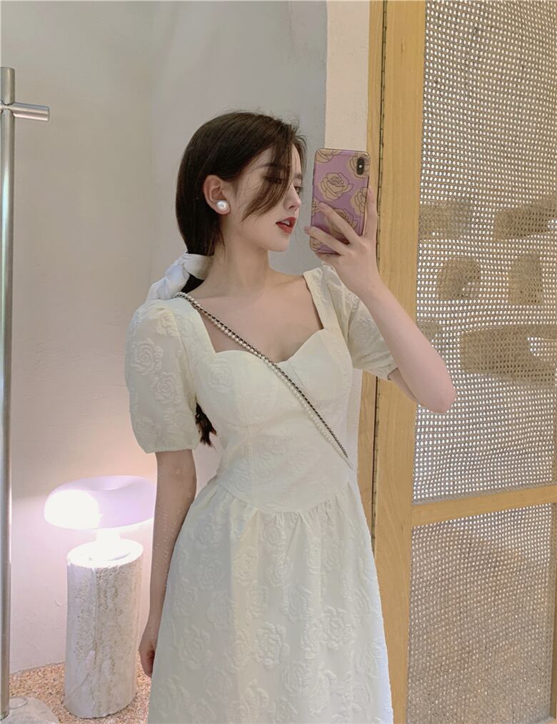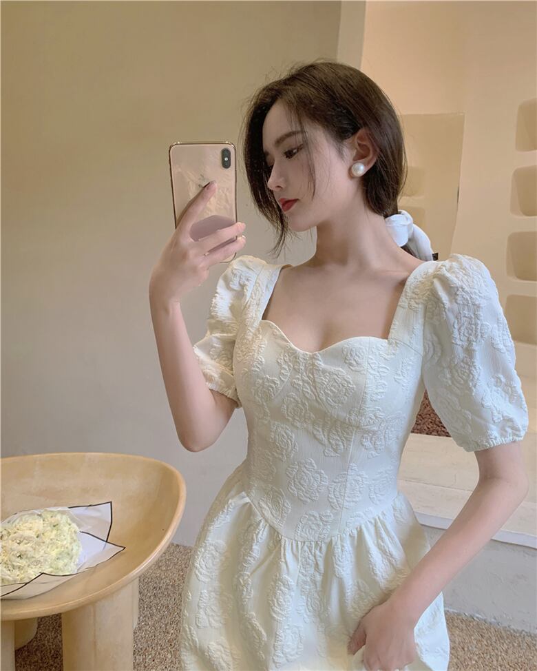 スタイルジャカードウェストホワイトスカート スリーブサマードレス レース エレガント 夏物 Xiaofeijia69451026944